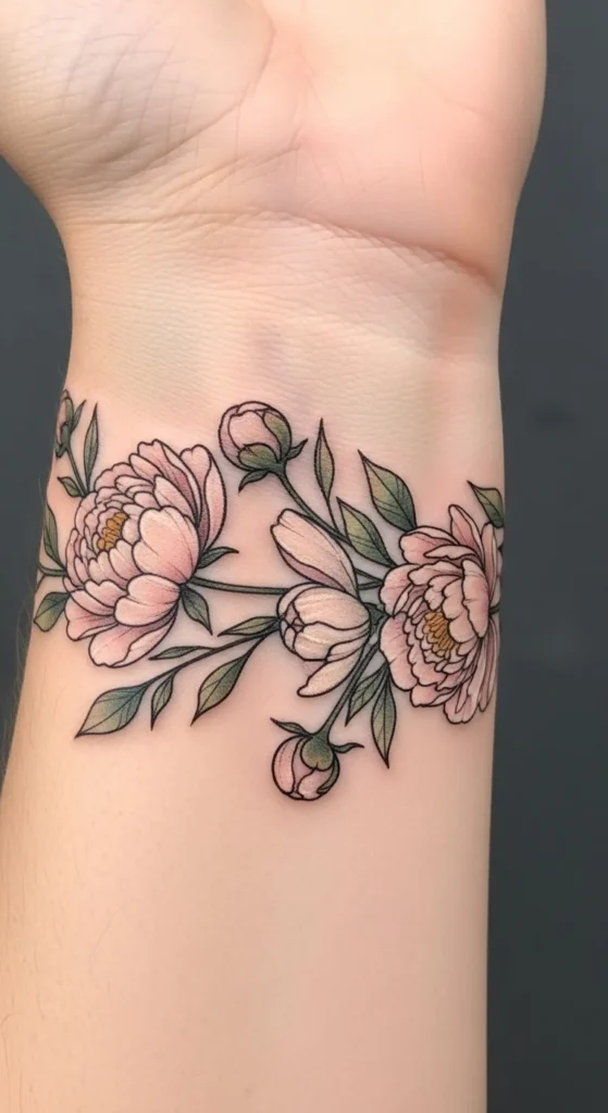 Peonies symbolize luck and affection. When designed as a soft wrist band, they look elegant without feeling heavy. Fine-line shading keeps the petals light. If you want color, choose muted pinks or water-wash tones. Try taping a paper band around your wrist and sketching soft petals to preview placement. A thin band is easier to maintain and works well for everyday visibility.
