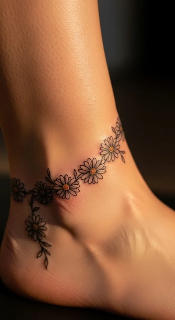 Daisies carry meanings of innocence, beginnings, and hope. A daisy chain works beautifully around the ankle, giving a soft jewelry-like feel. Keep the flowers spaced slightly apart to let negative space create an airy effect. To plan the shape, use a soft pencil and gently outline around your ankle. If you prefer something budget-friendly, choose a single daisy instead of a full chain—it still gives a meaningful look.