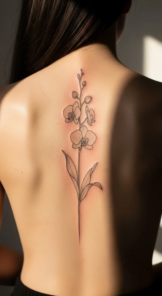 Orchids symbolize elegance and confidence. A vertical stem placed on the spine creates a graceful, elongated look. This works well for women who want something artistic but subtle under clothing. If you’re unsure about size, place a long ribbon down your spine and lightly mark where you want flowers to sit. Keep petals thin for a gentle finish.