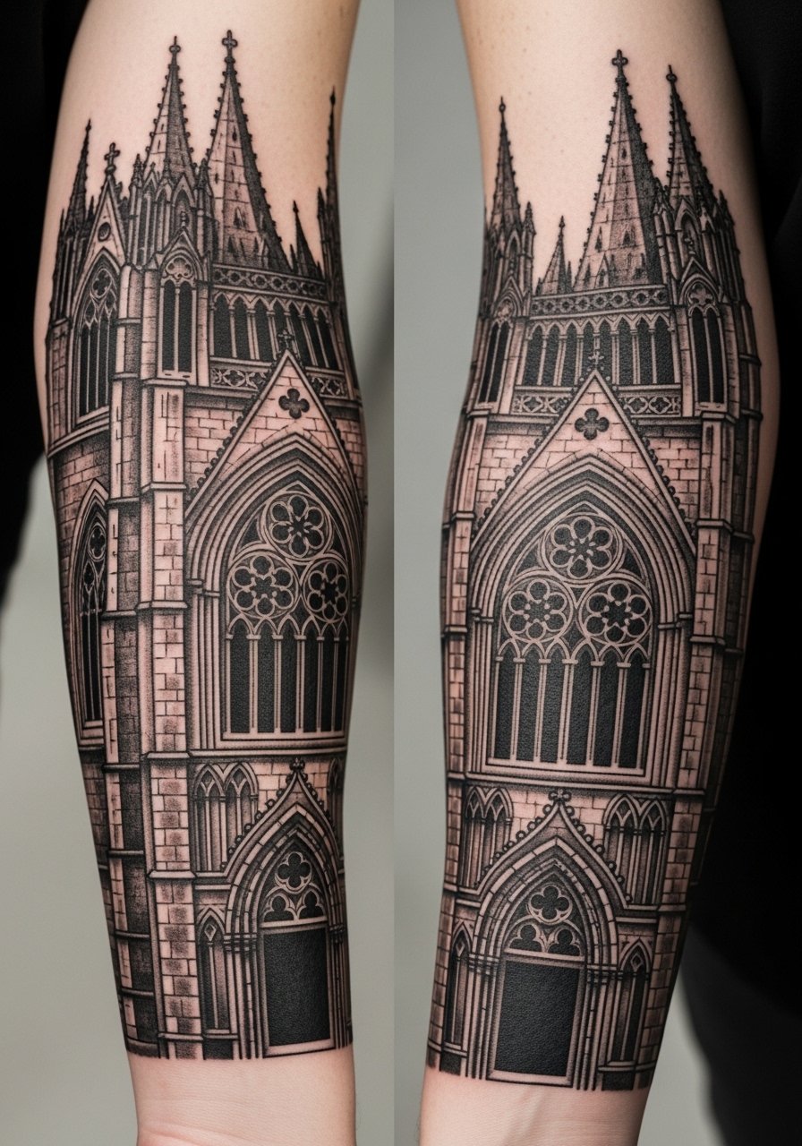 Solid blackwork brings Gothic architecture to skin. Columns, arches, and stained-glass silhouettes feel dramatic in negative space. Sleeves hide touch-ups well and the bold fills age predictably. Expect multiple sessions and long block-filling time. Pain varies across the arm—inner bicep and elbow hurt more. Healing benefits from heavy moisturization after the first week. From my experience, strong black fills resist fading best, while tiny architectural dots can wash out. Ask your artist about balancing negative space and solid areas so the piece keeps contrast as it ages.