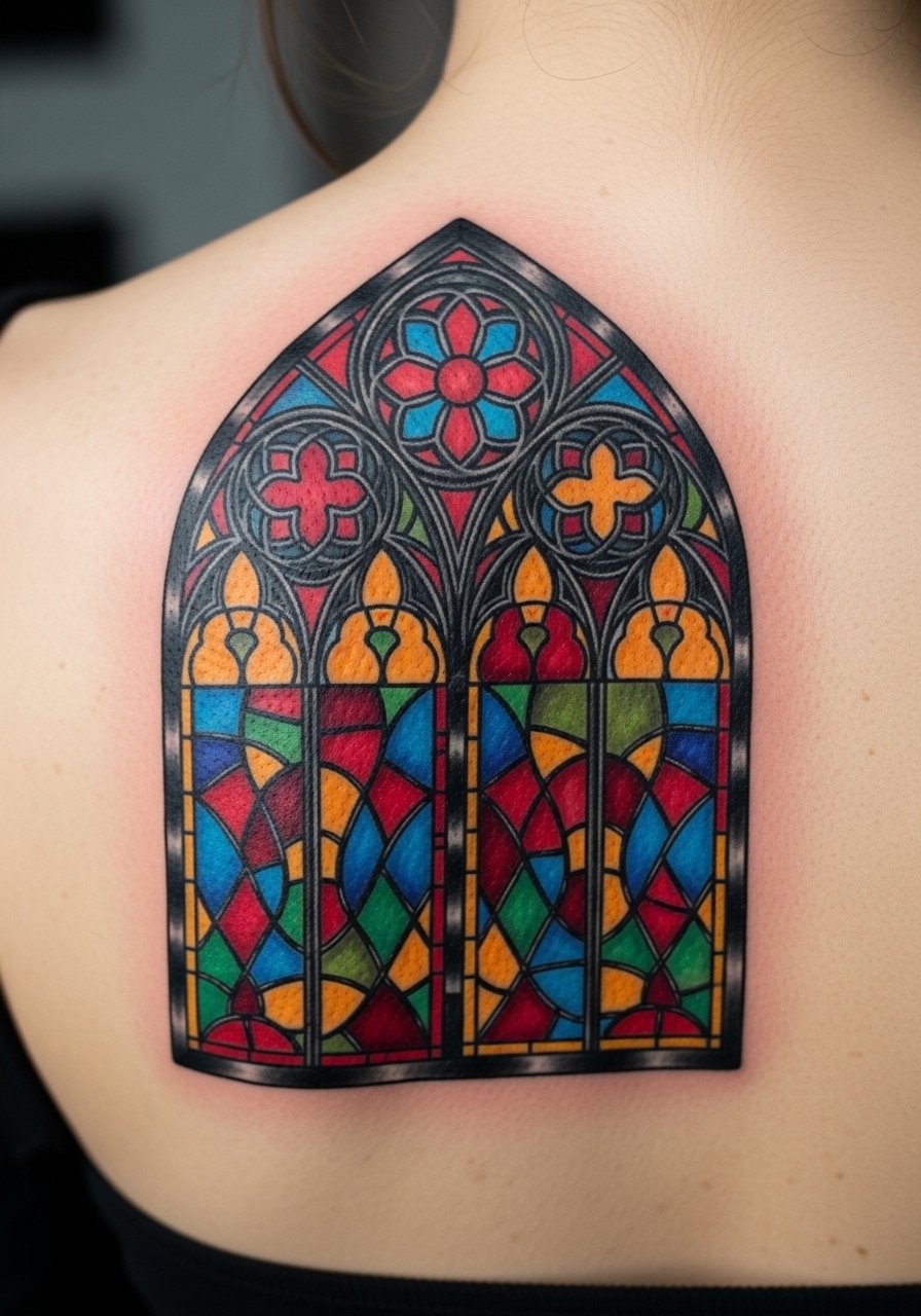 Stained-glass takes Gothic motifs into saturated color without losing drama. Bold black lead lines keep the design legible as colors fade. Upper back gives room for a rectangular panel and is easier to hide for work or formal events. Color heals differently—reds and yellows fade faster—so long-term maintenance matters. From what I’ve seen, artists who work with color gradients and clear separations between hues do this best. Avoid overly tiny color fragments; larger panes of color last longer and age cleaner.