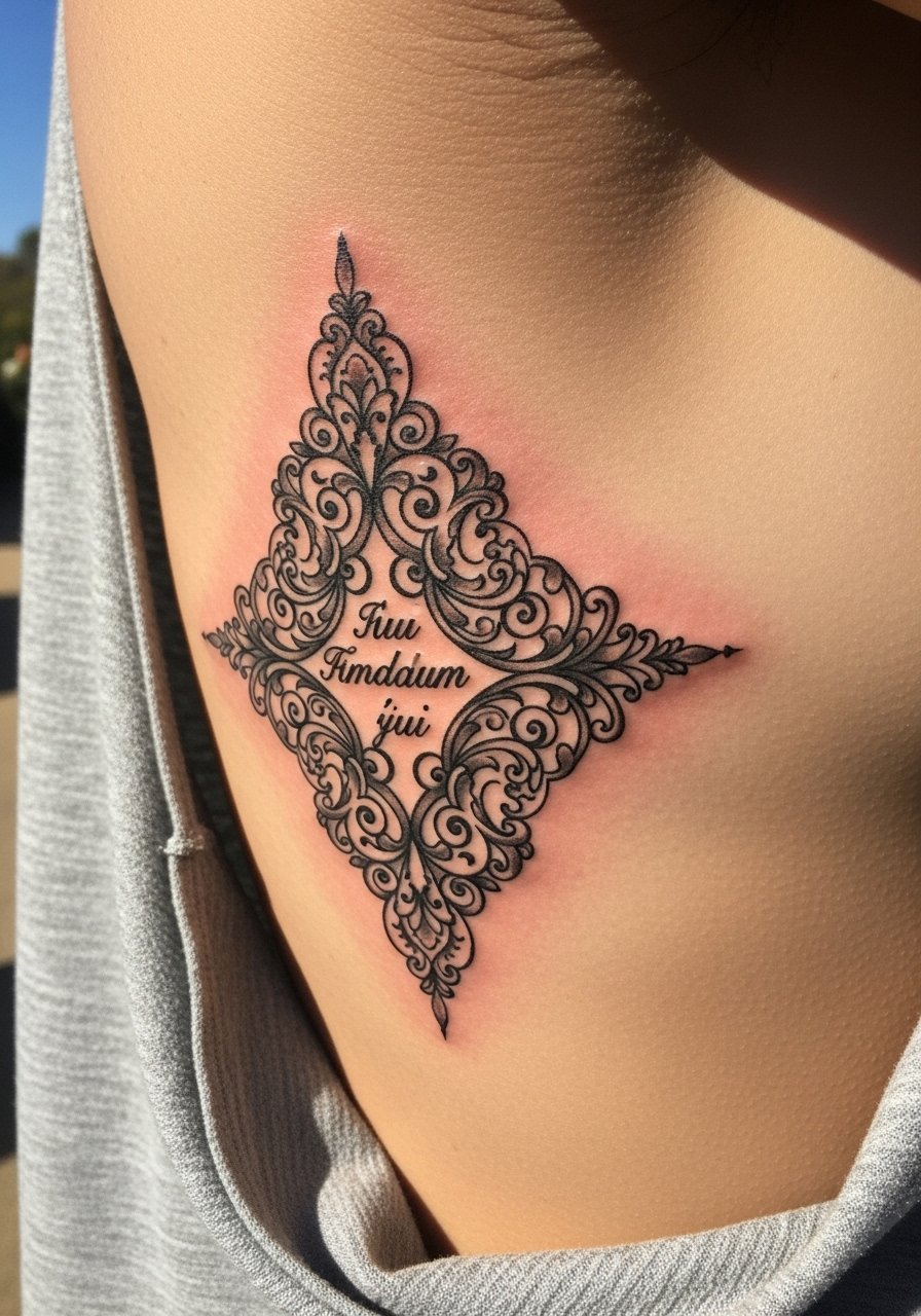 Ribcage filigree looks like a vintage locket spread across the ribs. Placement is intimate and easily covered, but it’s a painful area. I found that smaller filigree elements read best when paired with a bold anchor point so nothing gets lost in healing. Expect surface peeling and tender movement for the first week. Artists often recommend spacing script slightly from filigree lines; otherwise both can blur together as you heal. If you want readable lettering, use a heavier script weight than you might think.