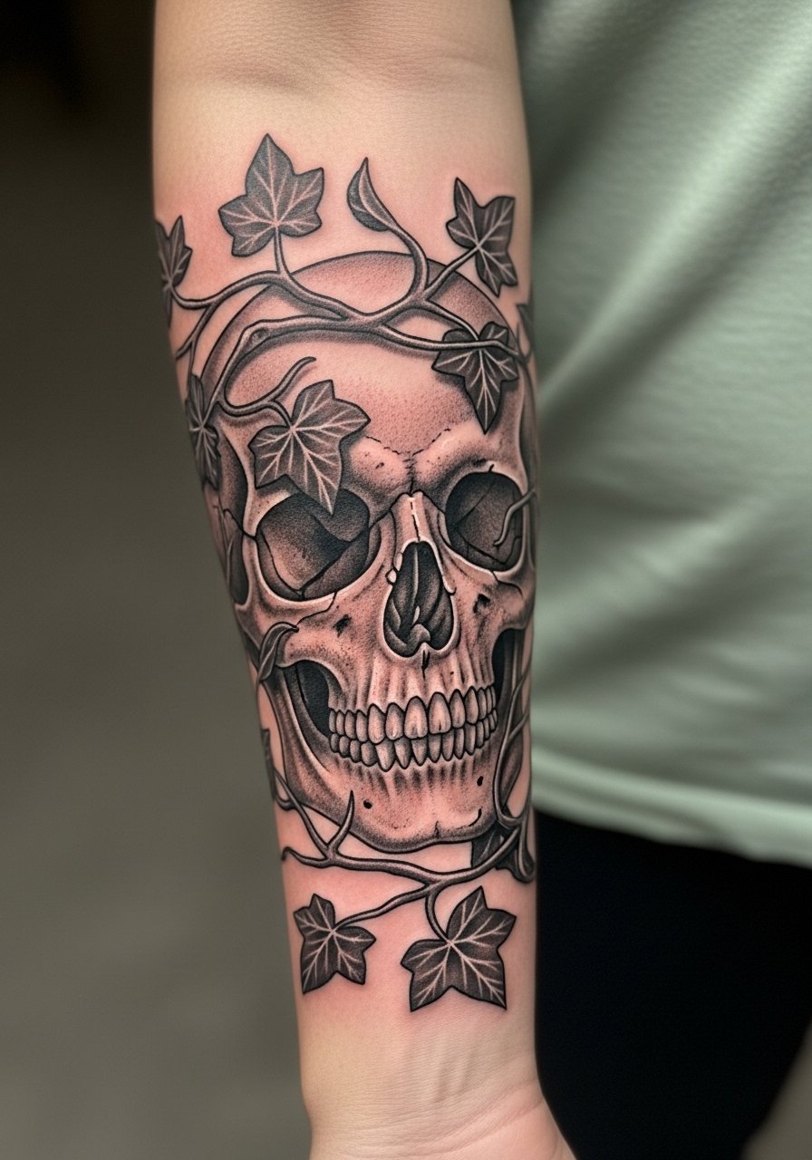 7. Skull and Ivy Half-Sleeve on Forearm