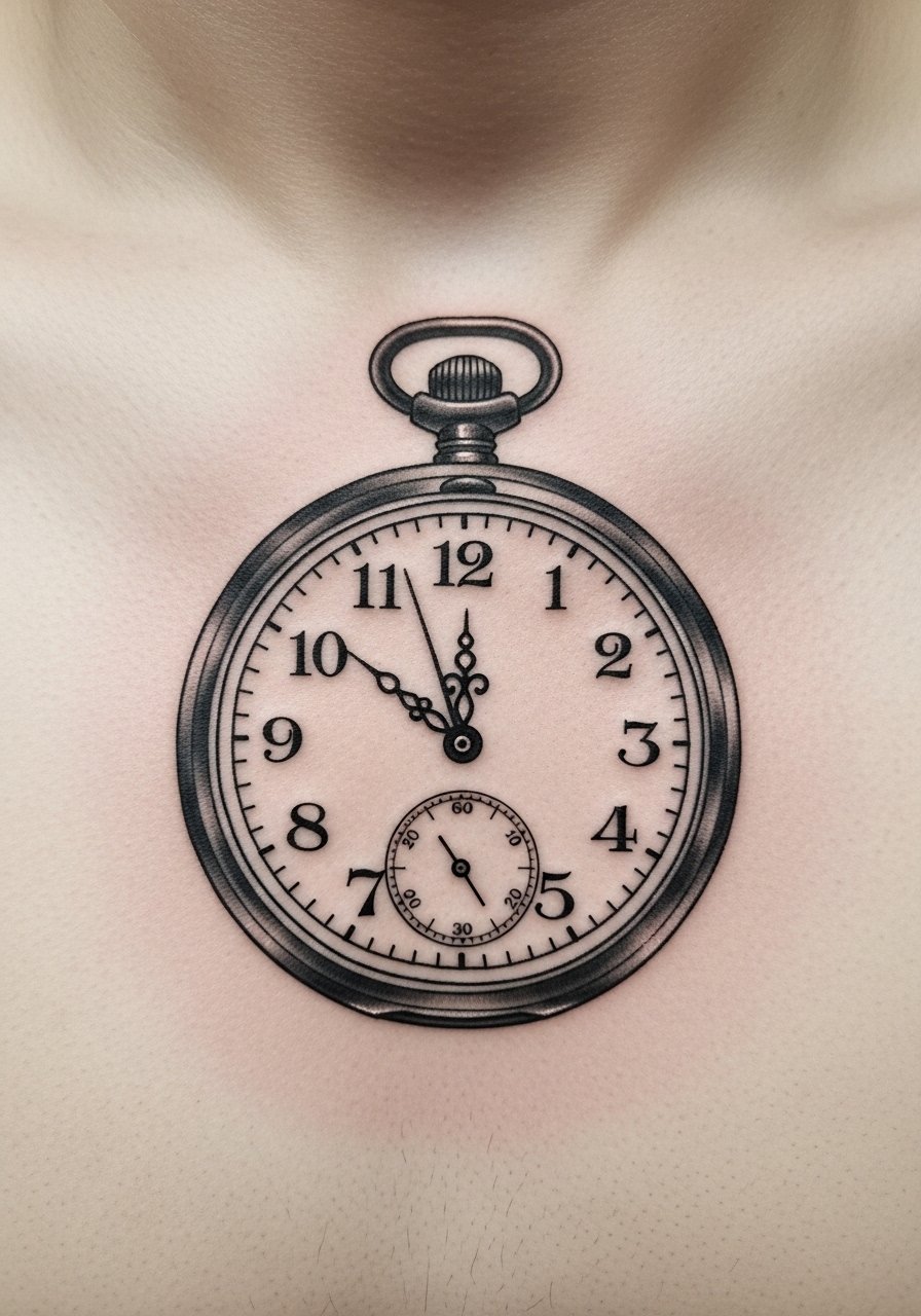 A pocket watch with skull motifs on the sternum feels like a Gothic timekeeper. The sternum is painful but powerful visually. Micro-realism needs crisp contrast so the watch face stays readable as skin softens. Expect longer healing and tender movement for the first 1–2 weeks. From my experience, artists who slightly over-ink shadow areas produce better long-term reading; under-inked grays can fade into a blur. Keep sunscreen on this area once healed to preserve tonal definition.