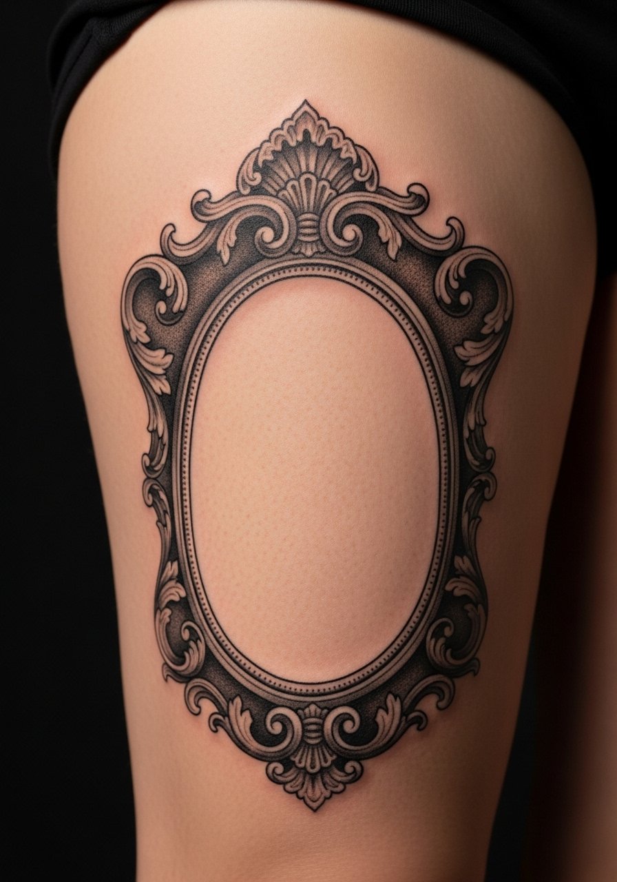 A baroque mirror frame makes for a decorative Gothic piece on the thigh. It’s an adaptable canvas—use it as a frame for another image later, like a portrait or scene. Thigh placement is lower pain and easy to hide. Ornamental curls read best with clear negative space and thicker outer lines. I’ve seen overly intricate scrollwork blur; opting for fewer, bolder flourishes keeps the design legible through healing and weight changes.