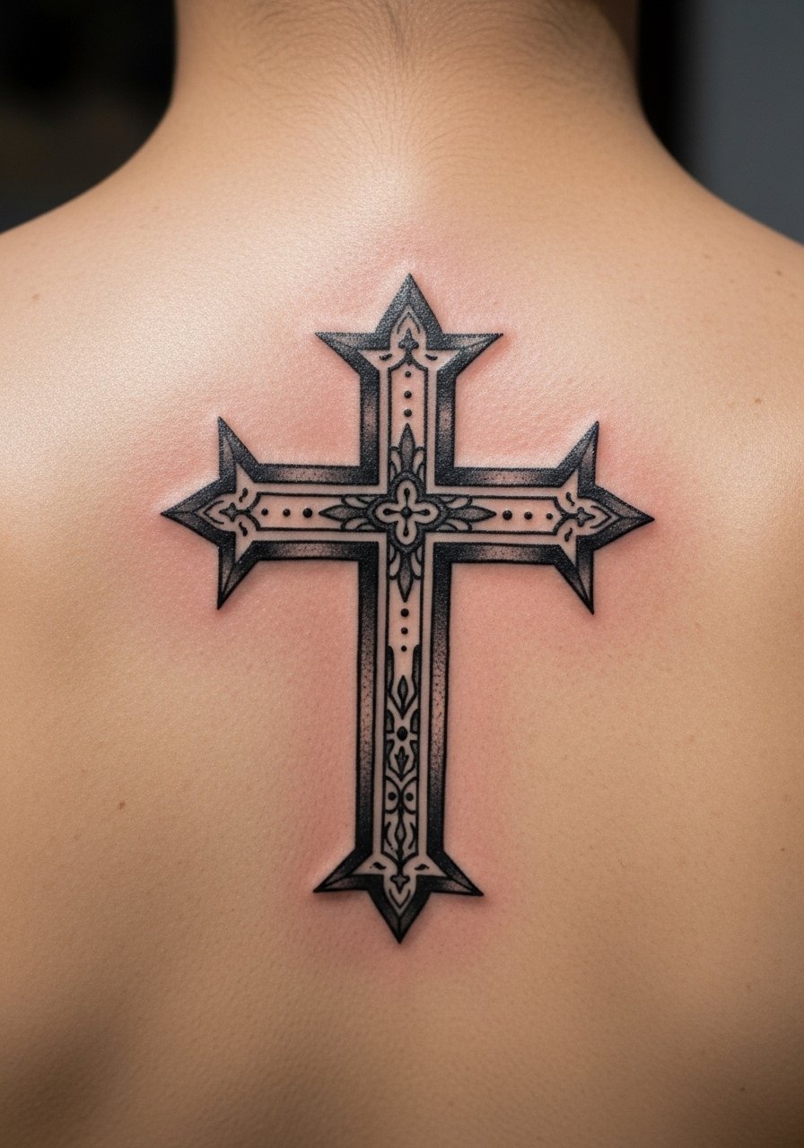 A spine-cross uses the body's vertical axis for dramatic effect. Spine tattoos are painful and demand short, focused sessions. Lines should be slightly thicker than you'd get on a forearm so the central column keeps crispness as skin moves. From what I’ve gathered, artists recommend planning for touch-ups on spinal work because movement and clothing rub can wear edges. Healed, the piece reads solemn and architectural.