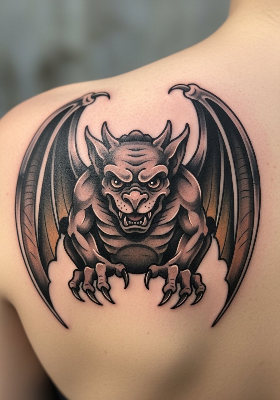Gargoyles are gothic icons with personality. Shoulder blade placement is great for mid-sized figures and tolerable in pain. Neo-traditional linework gives expression without tiny micro-detail that can fail. I’ve noticed pieces with balanced color and strong outlines keep their attitude as they age. Watch for too many fine texture lines—simpler shadow shapes usually look better long-term.