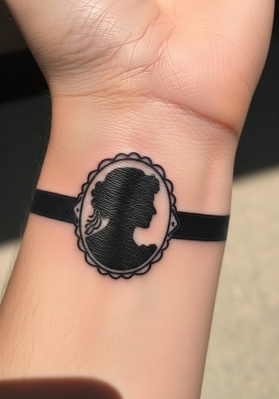 A cameo wrist band reads vintage and Gothic in a small package. Wrists move a lot, so simple silhouettes hold better than fine filigree. I’ve seen cameo silhouettes last years when artists used solid black fill and avoided ultra-thin frame lines. Keep sunscreen on this area once healed—it's exposed and prone to fading. For clarity, pick a silhouette with strong negative space.