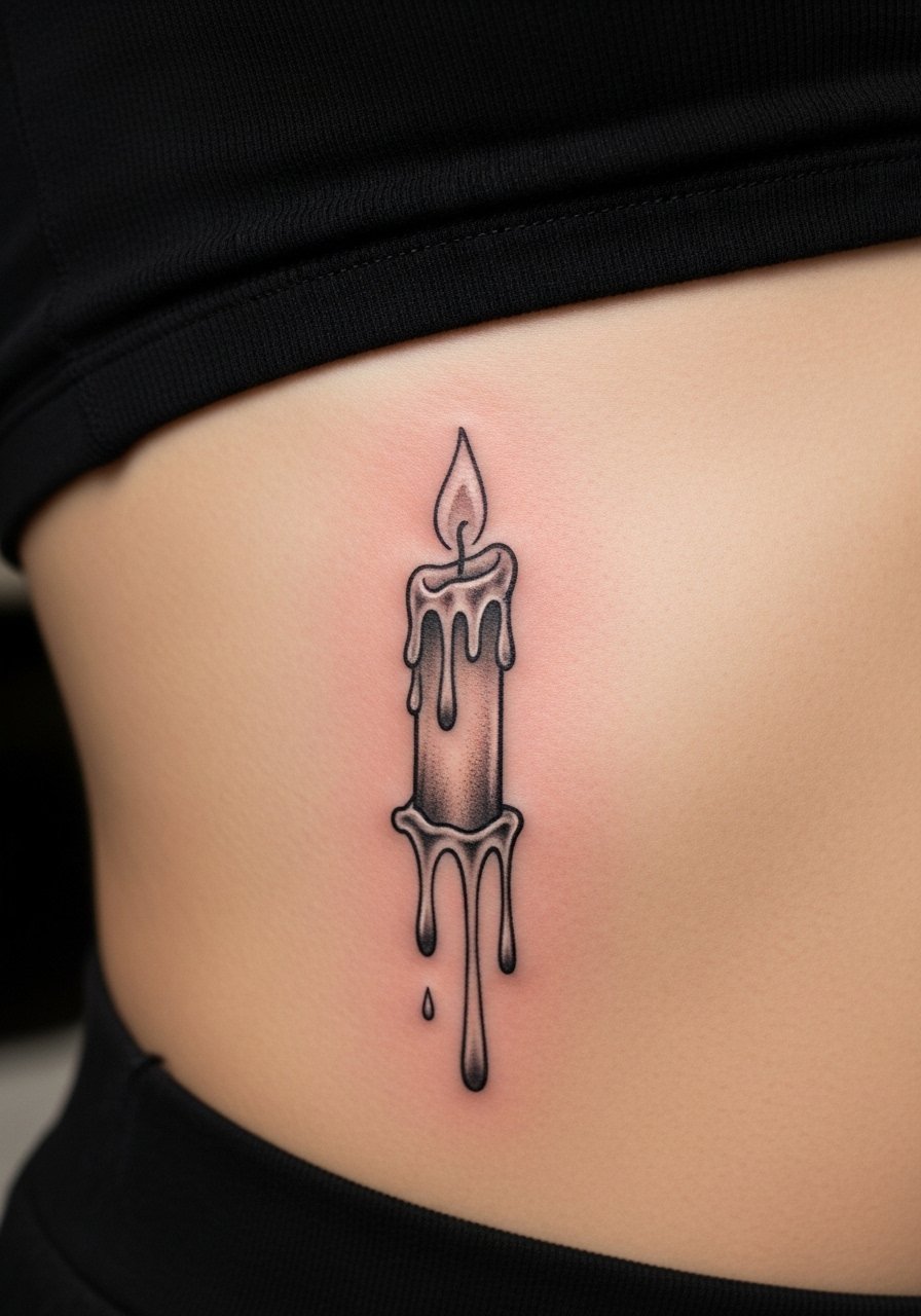 A candle melting into wax lines reads like a small Gothic narrative. Ribs are painful but great for tall, narrow imagery. Minimal realism works here—solid blacks for the candle base and softer gray for melted wax. I’ve noticed that outlining drips a touch bolder prevents them from disappearing in a year. Keep movement minimal while it scabs; turning can tug at the scabs and distort lines.