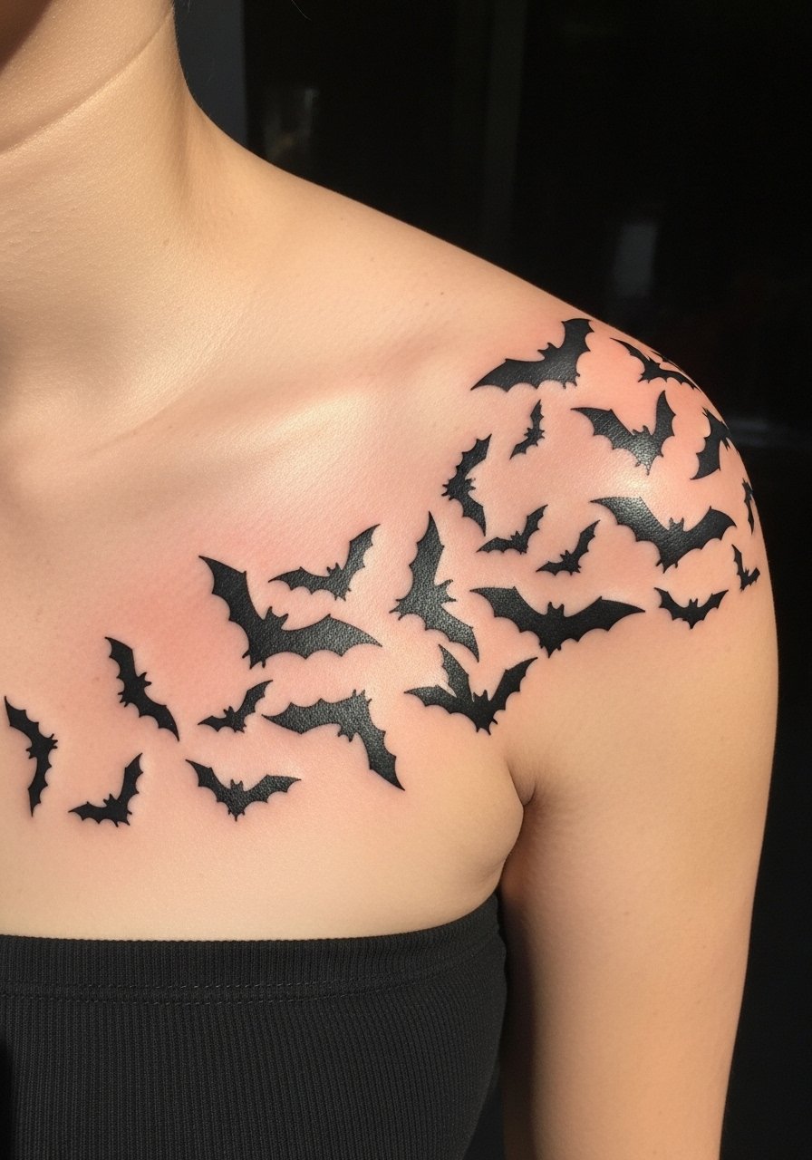 18. Blackwork Bat Swarm on Shoulder and Chest