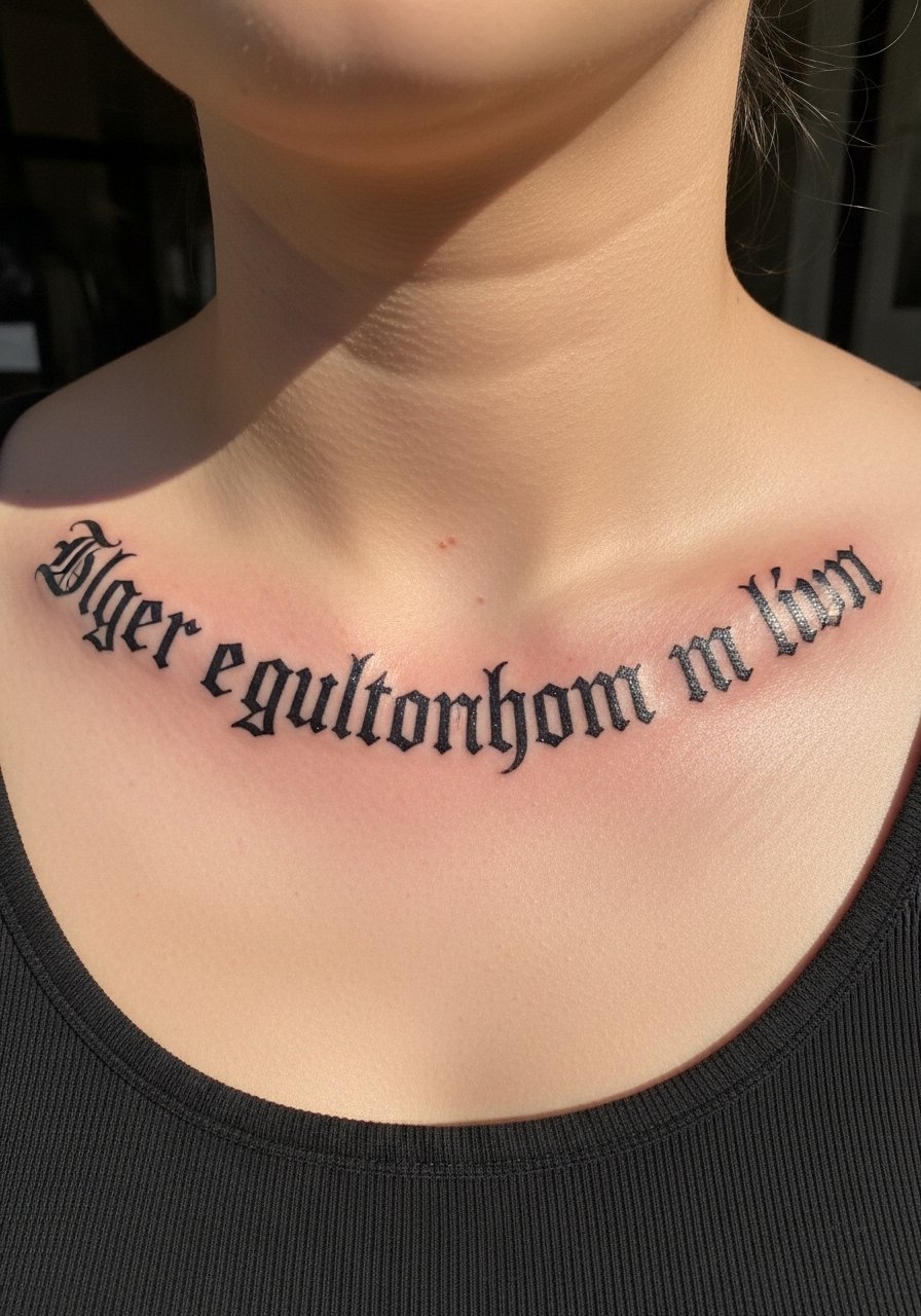 19. Gothic Scripted Latin Phrase Across Collarbone