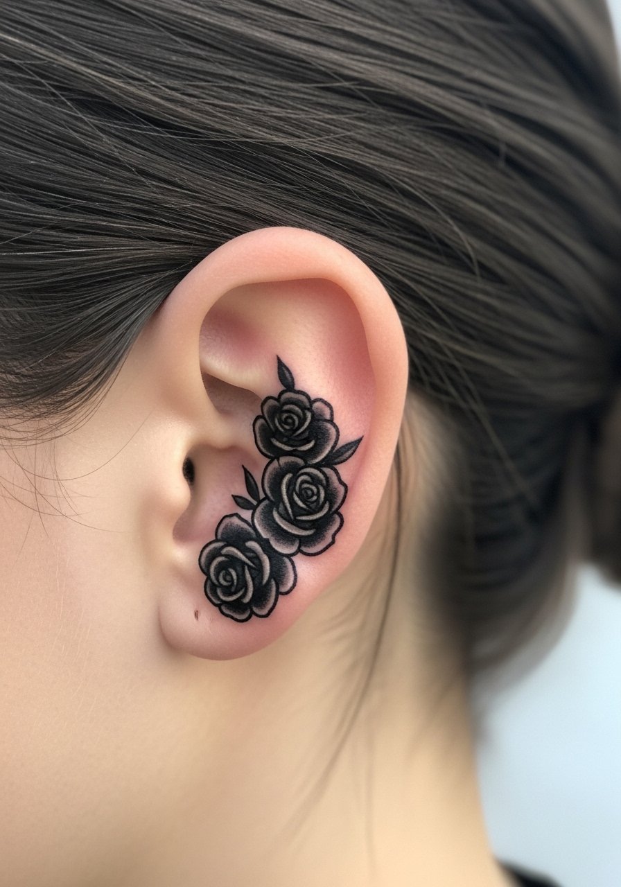 Behind-ear roses are low-key but carry Gothic weight. Pain is low; healing is quick. Solid shapes work better here than delicate petals. From what I’ve observed, a single bold bloom reads longer-term than many tiny petals. Keep your hair clean and avoid heavy shampooing the first few days.