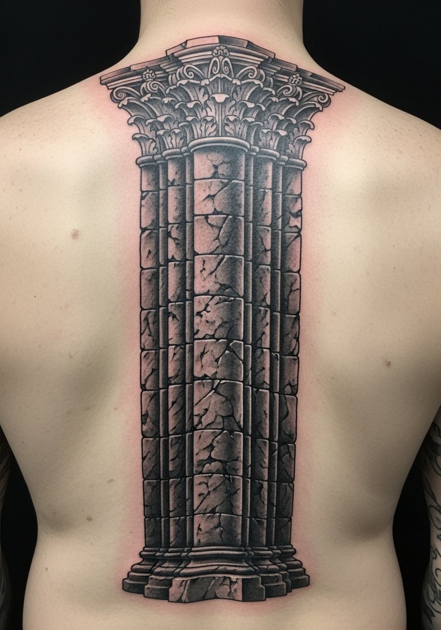 A column panel turns the spine into a Gothic facade. Pain is significant, so split into short sessions. Texture and shadow are key—too many tiny stippled details can fill in. I’ve noticed larger shadow blocks and clean negative spaces create a carved stone look that ages well. Expect initial tenderness and plan for touch-ups where clothing rubs frequently.