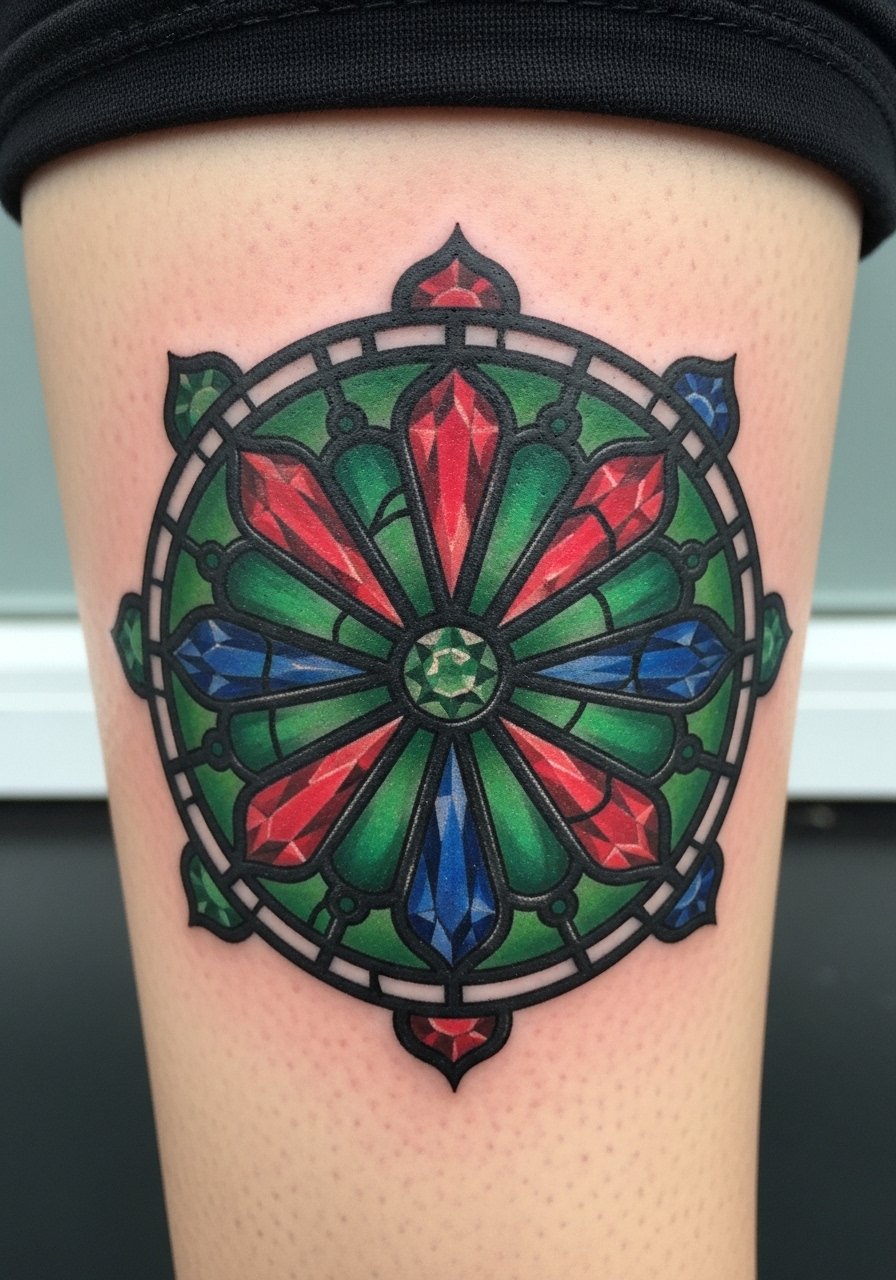 A round stained-glass medallion on the calf reads like a Gothic jewel. Calves tolerate longer sessions and are easy to protect during healing. I recommend distinct black lead lines to keep color panes from bleeding together. From what I’ve seen, color saturation initially looks intense and then calms during healing—plan for that visual shift.
