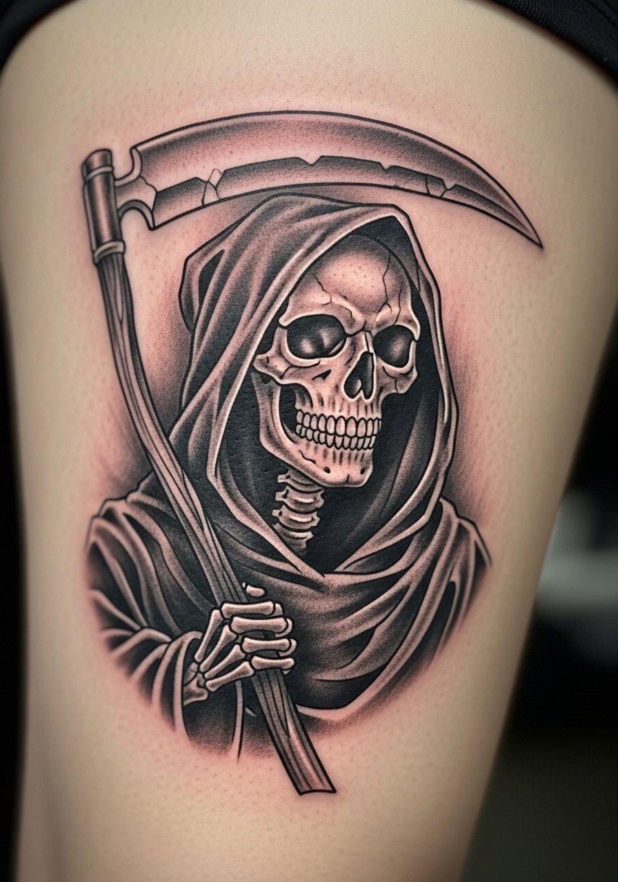 A Grim Reaper portrait on the thigh is a classic Gothic statement. Thigh canvas allows for mood and detail without extreme pain. Realistic shading gives it weight; bold cloak edges help the figure stay readable as skin settles. Avoid trying to cram too many tiny facial details—faces soften. In my experience, planning a secondary highlight layer at a touch-up session preserves depth.