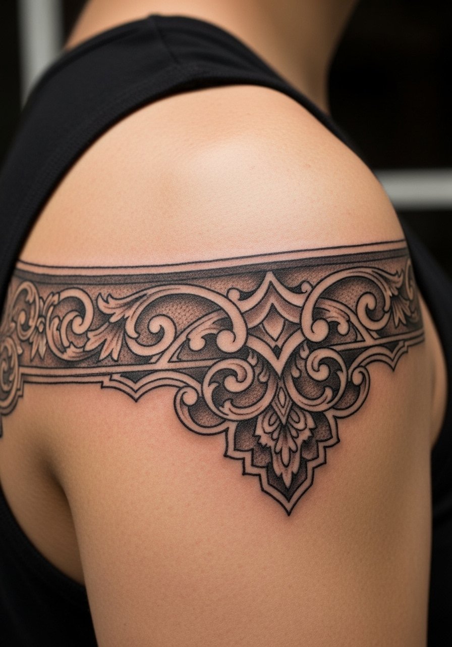 A baroque arm band reads like vintage jewelry with Gothic flair. Upper arm placement is mild in pain and easy to hide. I prefer band designs with repetition and clear negative space so the pattern doesn’t merge after healing. From what I’ve noticed, slightly thicker outlines in repeating motifs maintain crispness longer. This is a low-effort way to add Gothic detail that works with other pieces later.