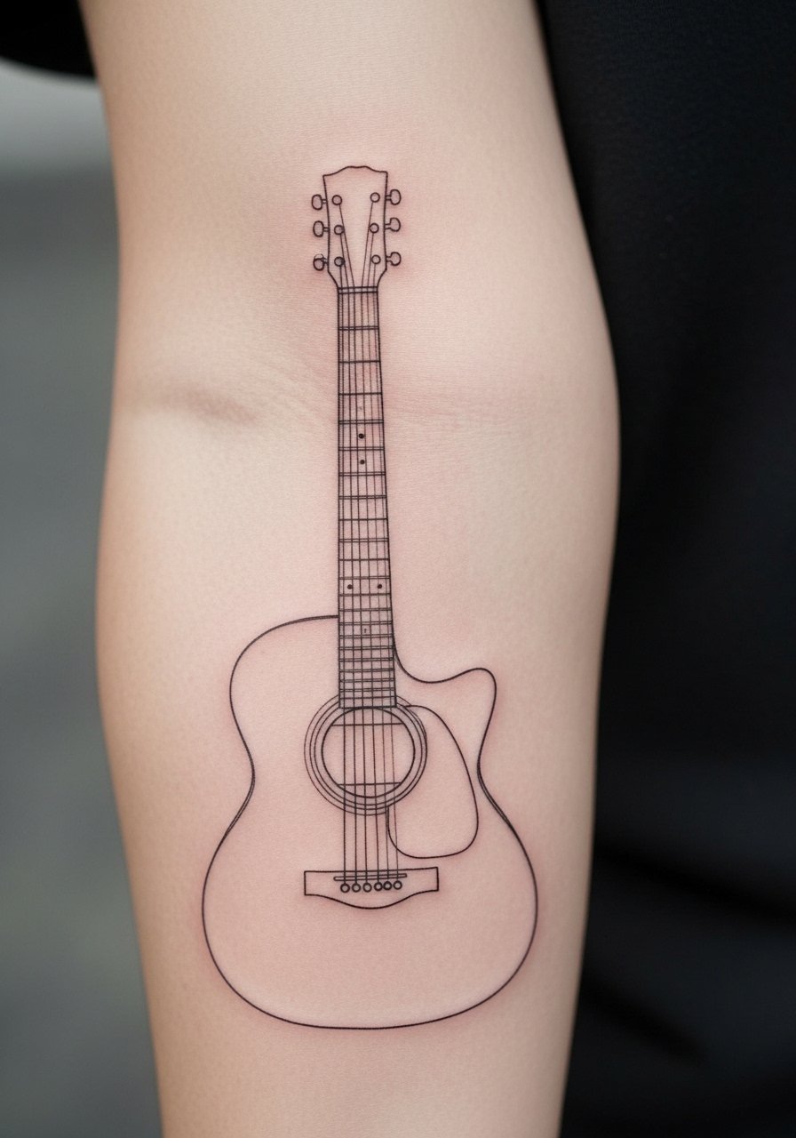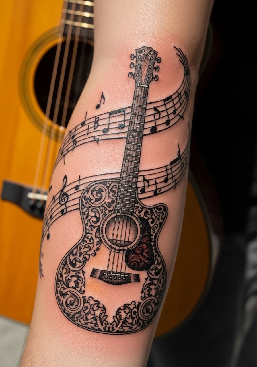 Combining a guitar with sheet music tells a story. A forearm wrap gives movement and visibility without extreme pain. Fine note lines need space to avoid blurring—ask your artist to scale notes slightly larger. Healing is straightforward; keep the area moisturized. From what I've seen, pieces that integrate negative space age cleaner.
