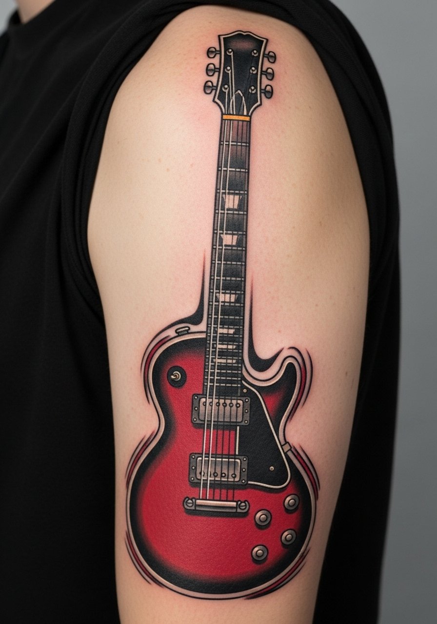 Neo-traditional guitars mix bold outlines with painterly color. Upper arm gives enough space for the body and headstock while keeping pain low. Colors pop fresh and mellow slightly with time; red and blue hold up well compared to pastel hues. Artists who work in neo-traditional or tattoo realism can balance line and color for long-term vibrancy. Common mistake: oversaturating tiny details—keep shapes stronger than tiny textures.