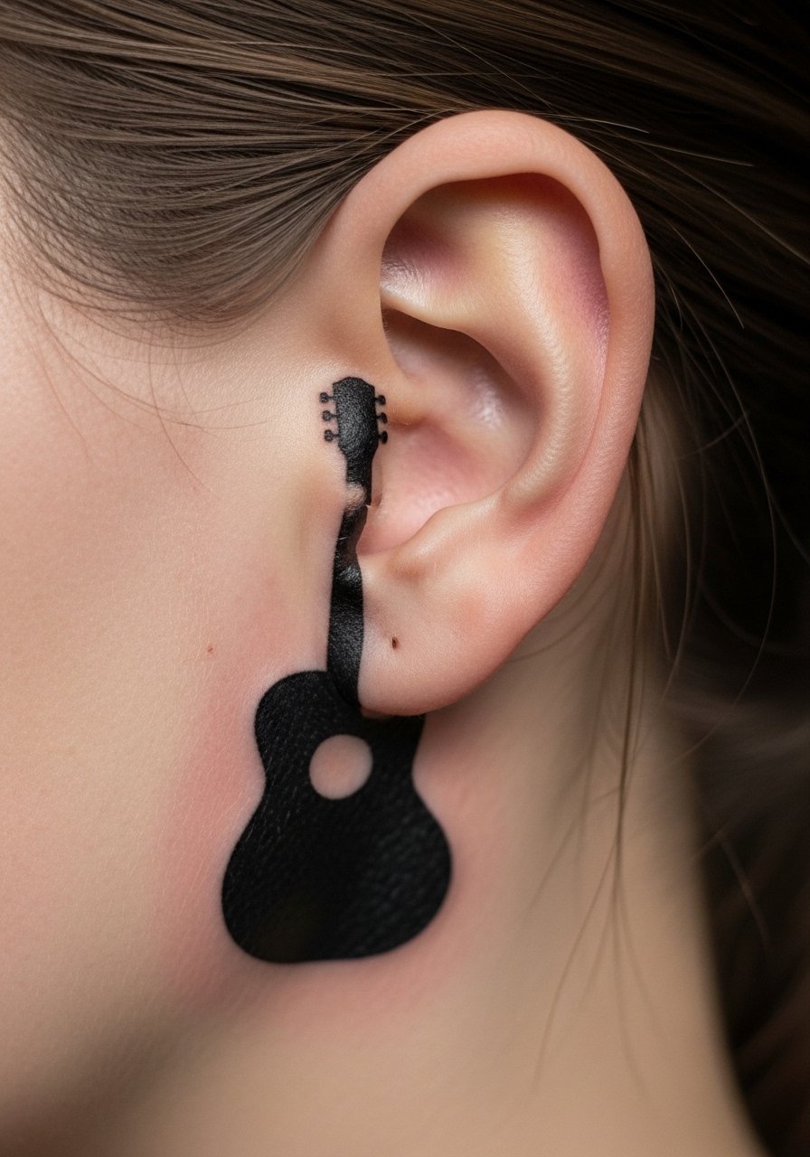 4. Blackwork Guitar Silhouette Behind Ear / Nape