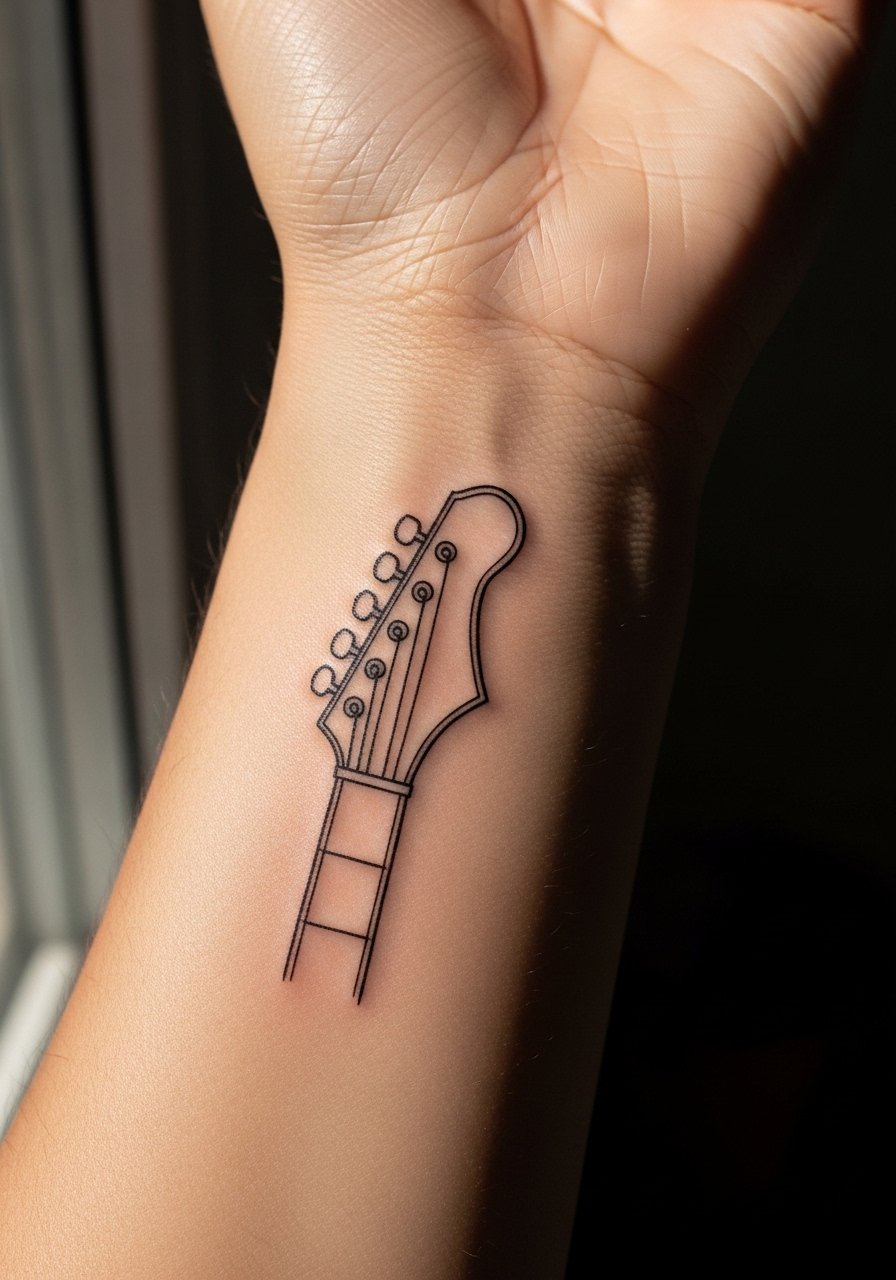 A small headstock in one continuous line looks modern and meaningful. Wrists heal quickly but are sensitive and prone to blur if lines are too close. Expect a sharper pain for placement but fast healing in two weeks. Ask for slightly thicker lines than a single hairline so the piece still reads after a year.