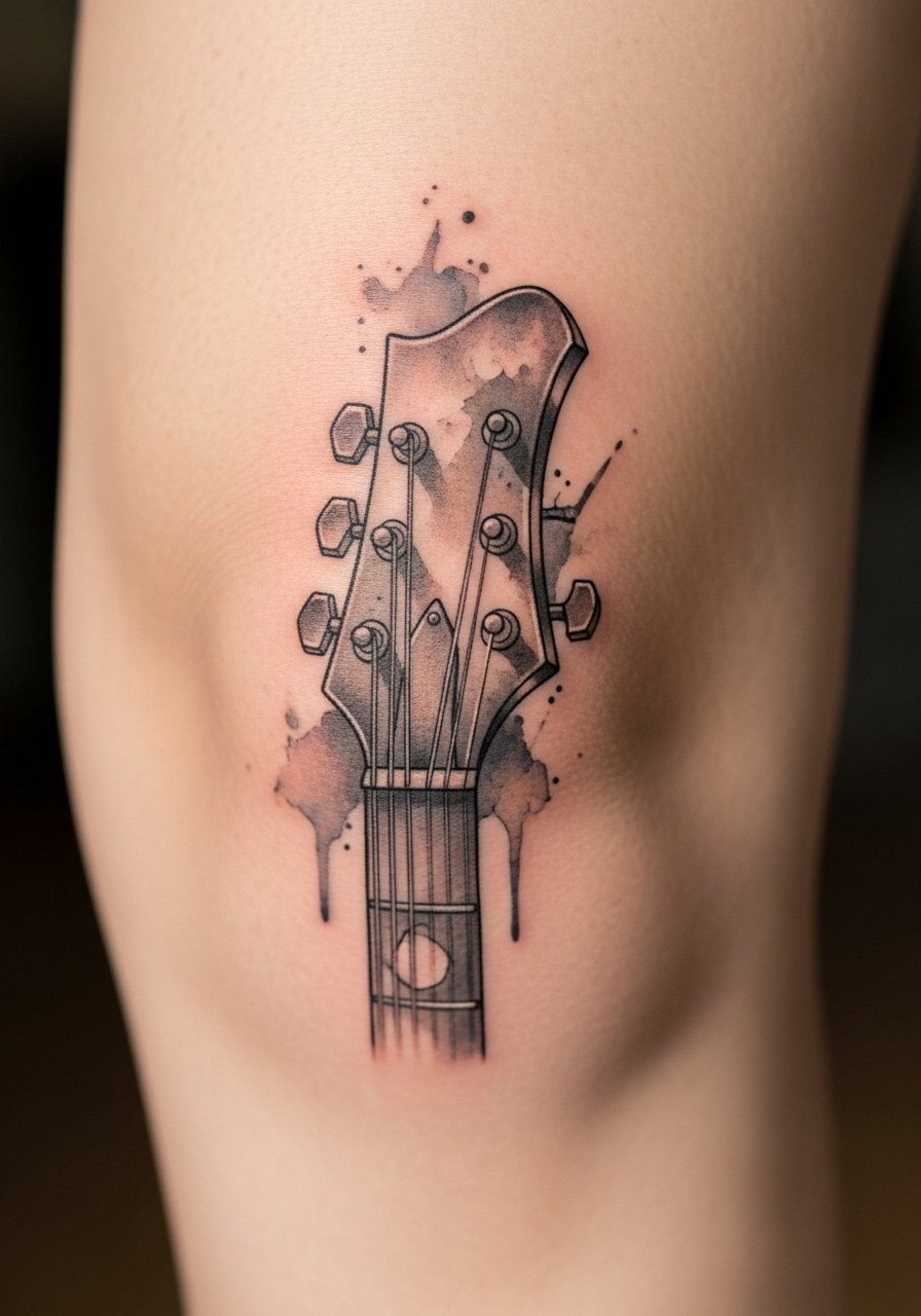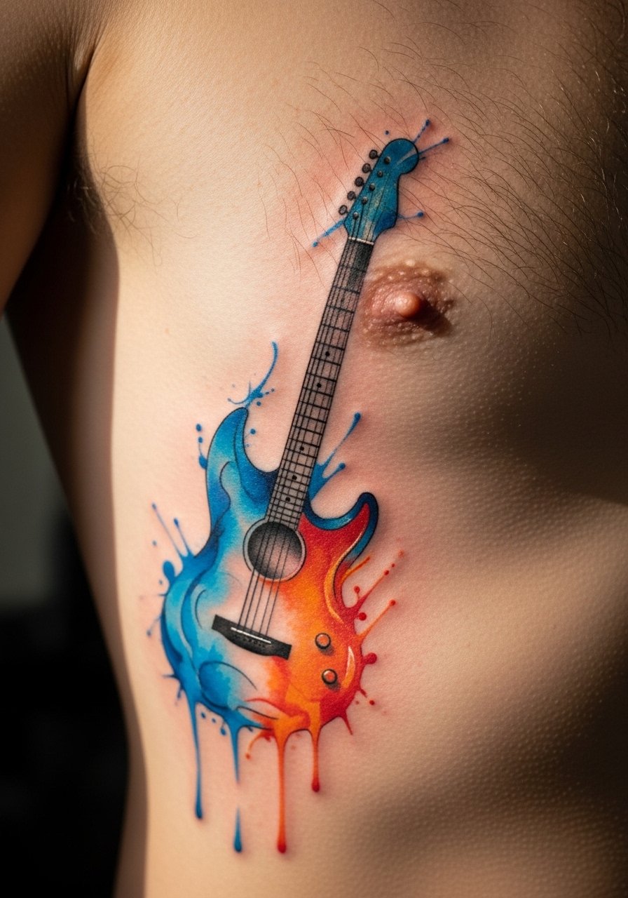 Watercolor gives guitars an expressive, artistic vibe. Ribs are high on pain but excellent for big flowing compositions. Colors look brightest fresh and soften into a muted palette healed, so expect some blending. Artists who blend water-based color and soft shading make these age better. Common mistake: tiny watercolor droplets that fade—stick to larger washes.