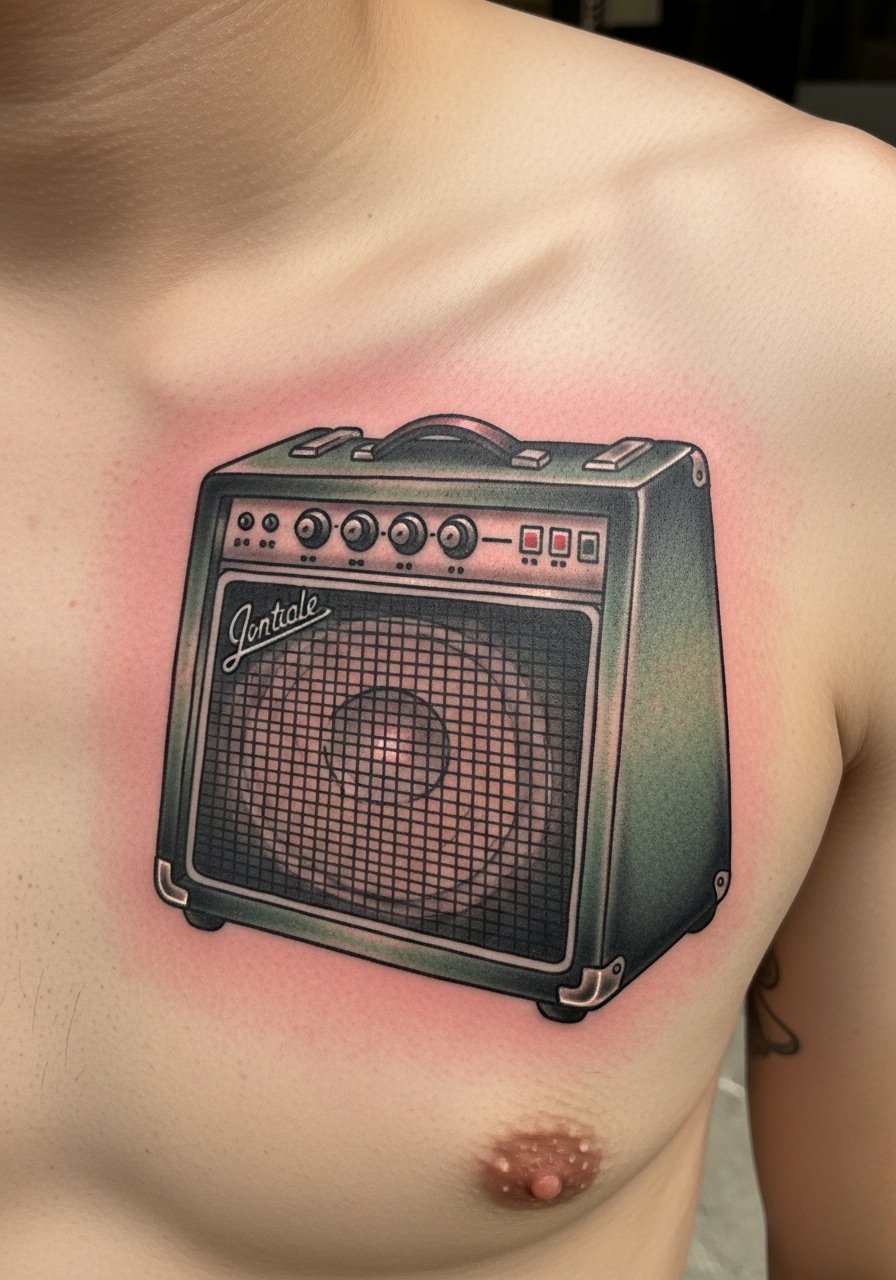 A vintage amp adds personality to guitar ink. Chest placement sits flat for detail but can sting near bone. Traditional bold lines help the design hold up. Expect 2–3 weeks of surface healing; the chest may scab a bit more. I recommend artists familiar with neo-traditional gear work to get hardware details readable.