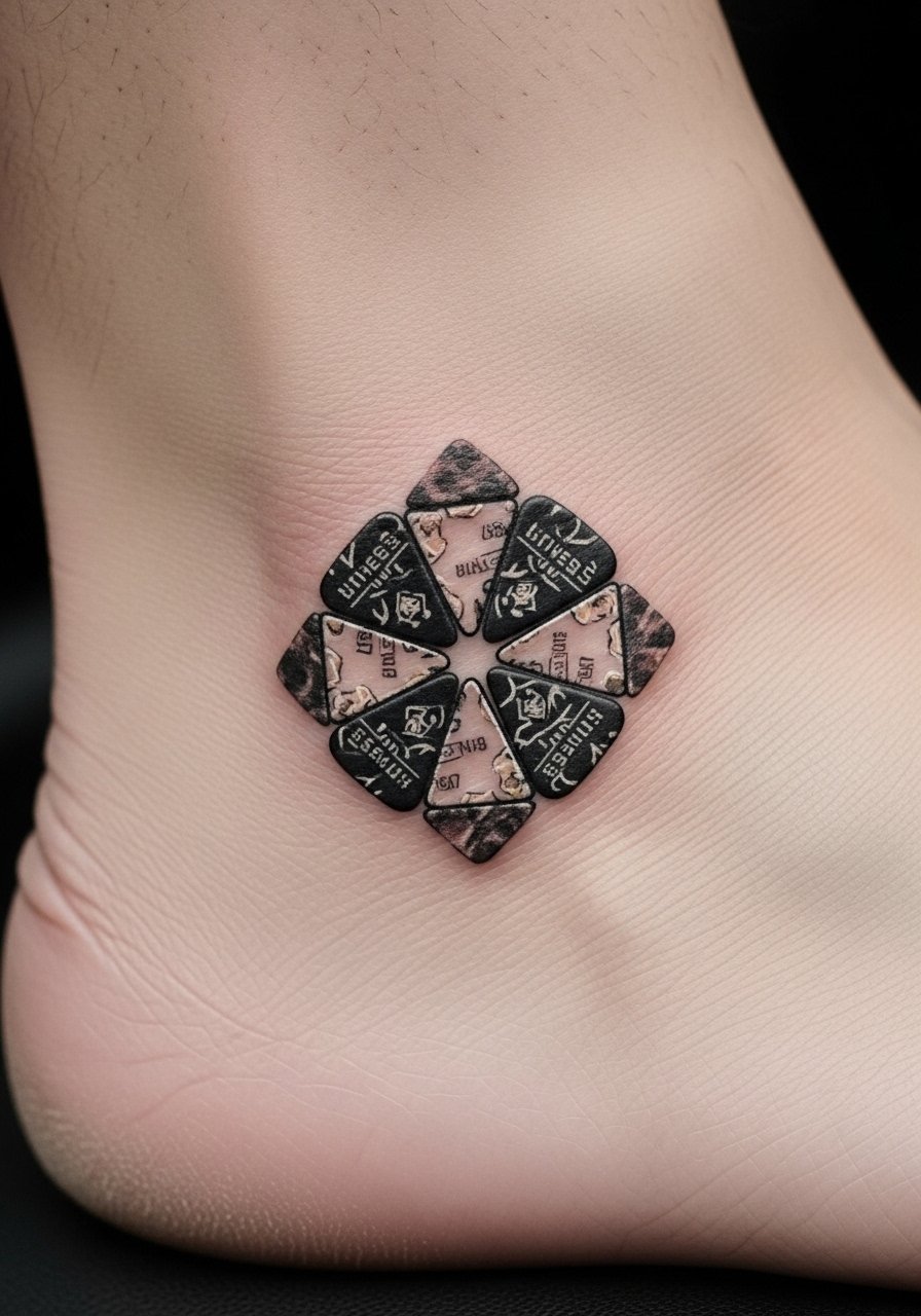 Pick mosaics are playful and symbolic. Ankles are sharp in pain and prone to fading from shoe friction. Keep shapes bold and avoid tiny gradients. In my experience, simple black outlines with a pop of color last longer than tiny colored fills.