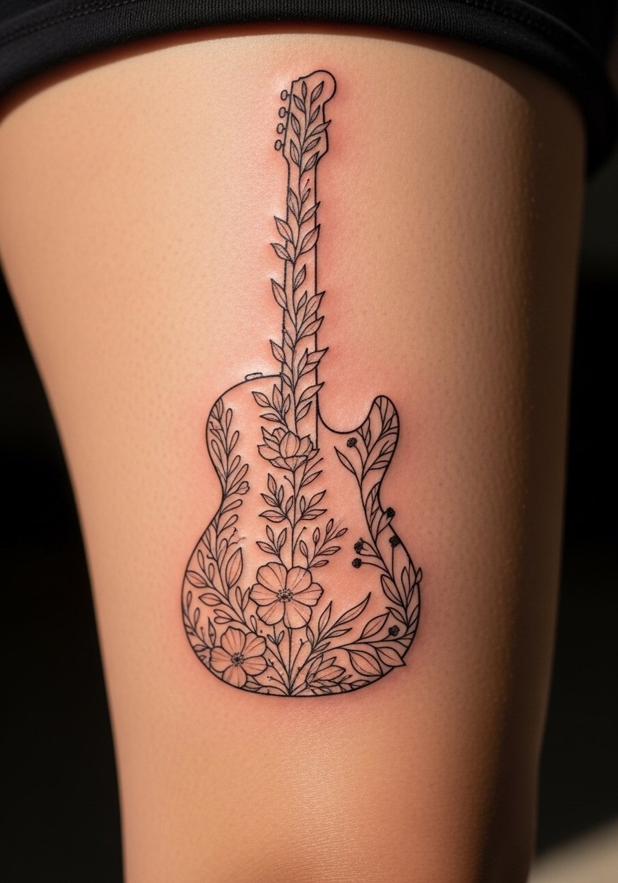 Botanical elements soften guitar imagery. The thigh gives room for composition and is less painful. Fine line florals need breathing room to avoid blurring; larger petal lines help. I’ve noticed these heal beautifully when the artist balances delicate stems with stronger guitar outlines.