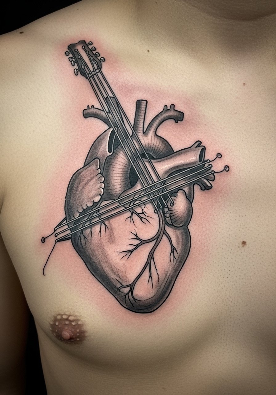 16. Anatomical Heart Intertwined With Guitar Strings on Sternum