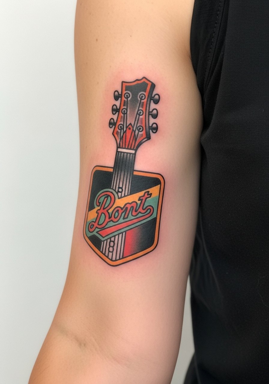 A badge or patch feels like band merch you can wear forever. Biceps are low pain and hold color well. Traditional styling helps the design stay readable years later. Ask for clear negative space near tuners to avoid ink bleed.