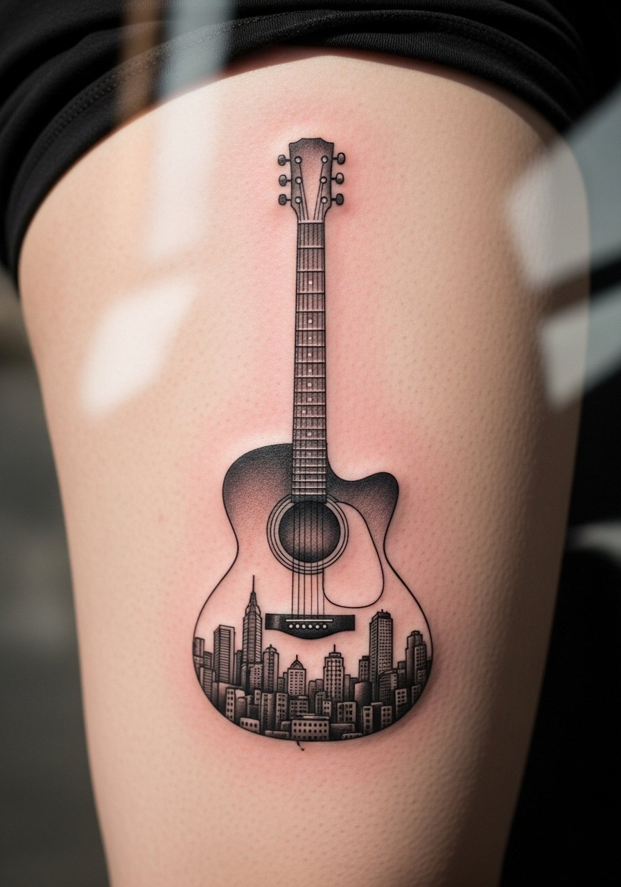 18. Double Exposure Guitar + City Skyline on Side Thigh