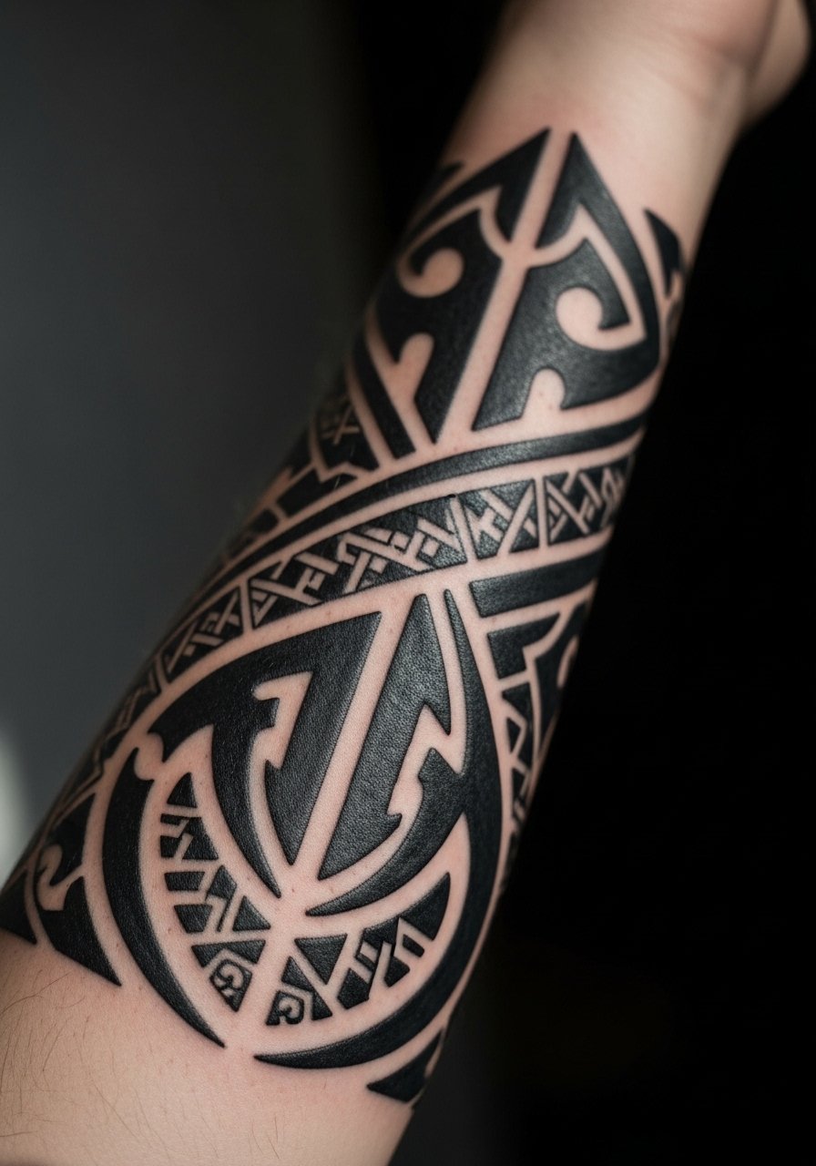 A repeating guitar band reads like cuff jewelry. Blackwork is low-maintenance and ages predictably. Keep patterns bold; thin filigree loses crispness over time. From conversations with artists, these are popular for their statement quality.
