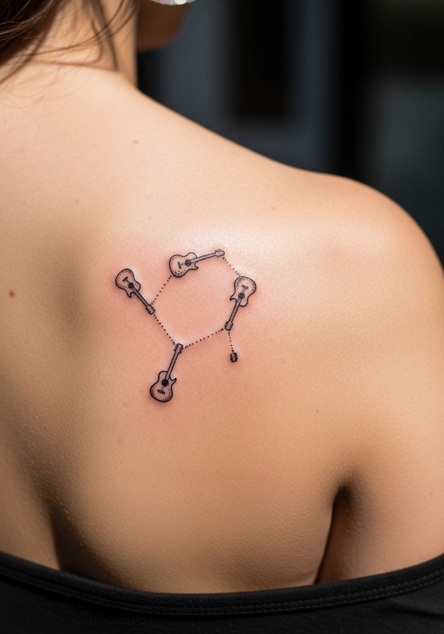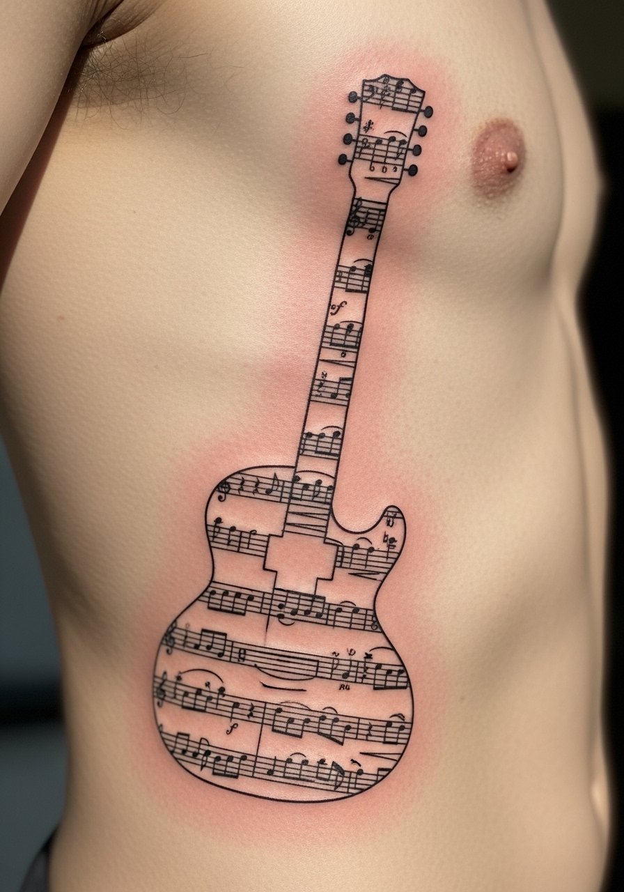Using negative space to form a guitar is clever and subtle. Ribs hurt, but the visual payoff is strong. Ensure the notes are scaled so they remain legible once healed. I prefer this approach for people who want depth without heavy color.