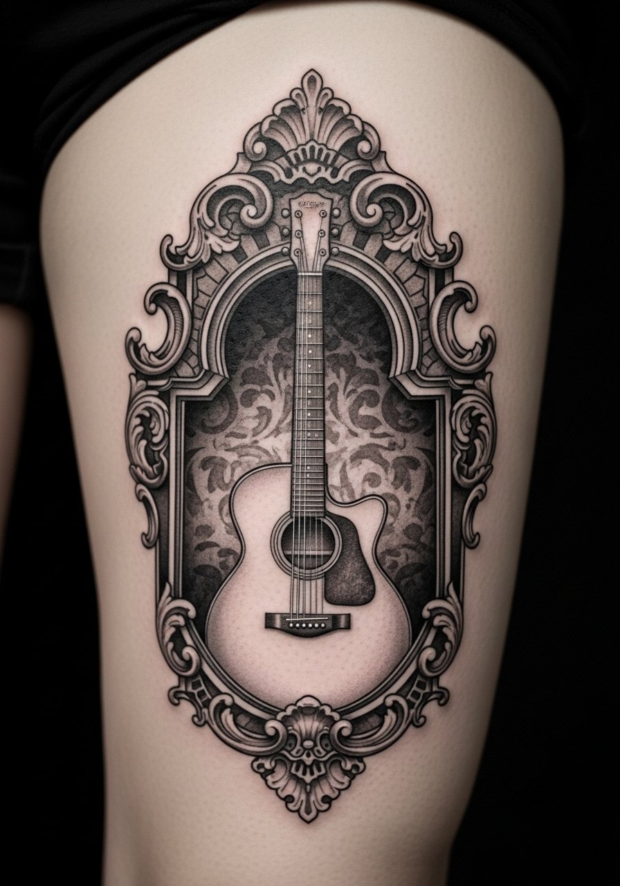 Ornamental frames lend a classical vibe to guitar art. Upper thigh holds detail and is easy to conceal. Keep filigree balanced; too many tiny curls can blur. Artists who work with ornamental realism can keep lines crisp.