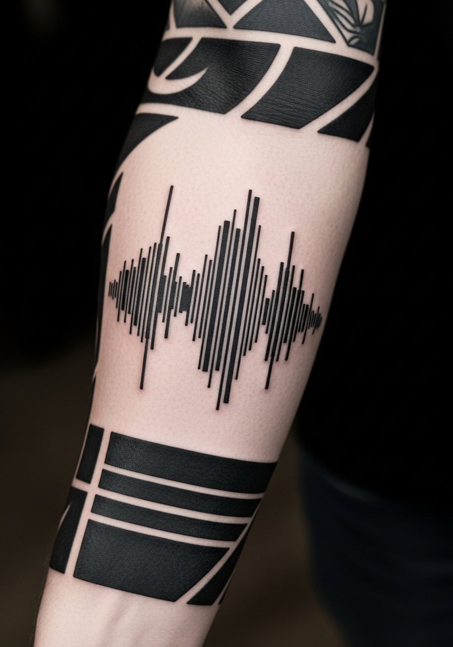 As an accent within a sleeve, barcode soundwaves add rhythm. Forearm placement balances visibility and pain. For sleeves, ensure the soundwave integrates with surrounding elements to avoid visual clutter. Blackwork here keeps the look lasting.
