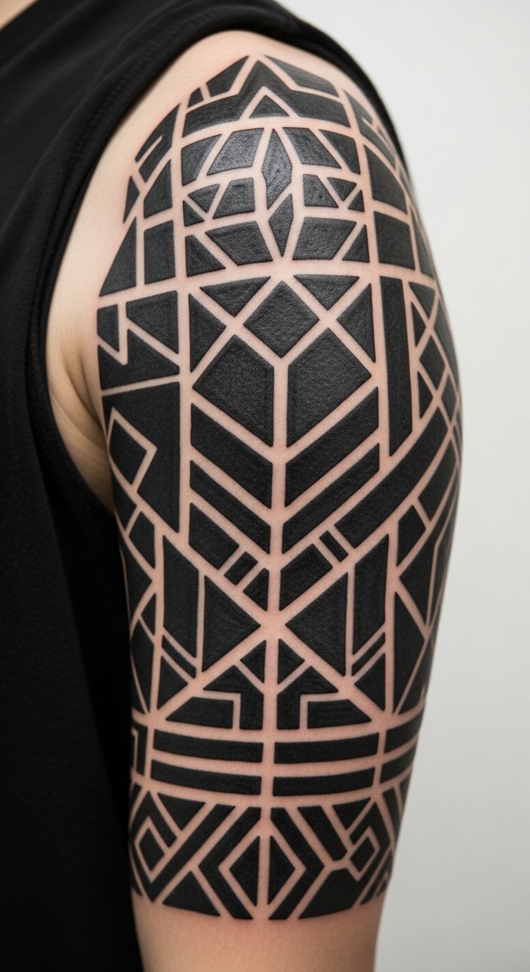 Blackwork is durable. Large black areas age well and can mask scars or older tattoos. Geometry adds a modern, architectural feel. Upper-arm muscle movement can distort tiny patterns — choose bold shapes. Expect steady buzzing during sessions but manageable pain. Healing needs consistent moisturizing to prevent scabbing in heavy-fill areas. Common mistake: overly tight micro-patterns that blur. Ask for tested pattern scales that read when healed.
