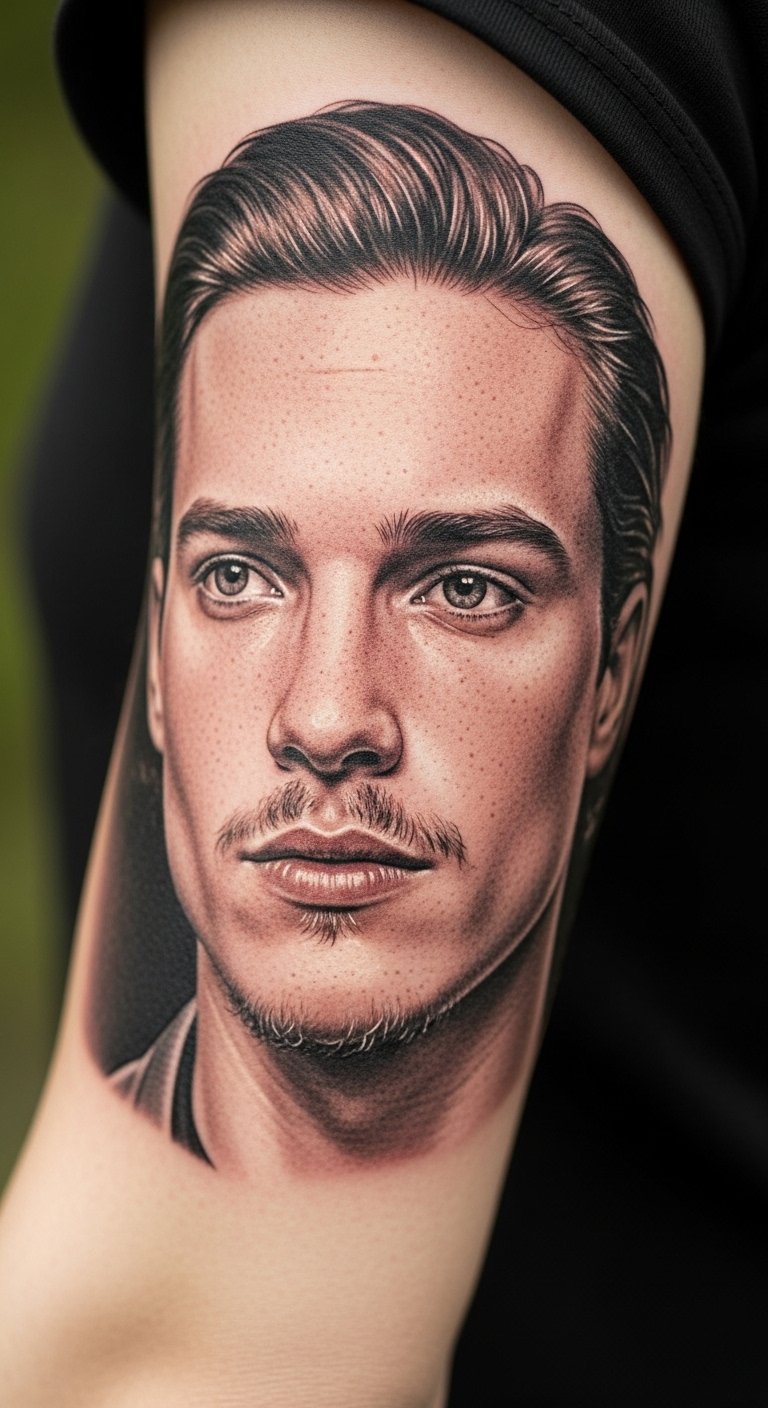 Portrait realism looks stunning on a half sleeve because there's room for tonal shading. Outer bicep is a stable canvas, but realism demands an experienced artist. Pain varies with shading density. Healed portraits can lose tiny highlights — ask your artist to plan contrast for long-term readability. A common mistake is using low-saturation color in tiny facial details; stick with strong mid-tones and crisp edges where needed.