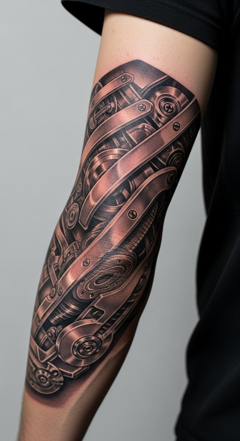 Biomechanical plays with depth and movement around joints. Elbow wraps look dramatic but are painful and require careful placement so motion doesn’t break illusion. Heavy black and shading age predictably, but tiny realistic textures can soften. Avoid overly small mechanical detail that blurs. Ask for healed photos of joint-area work.