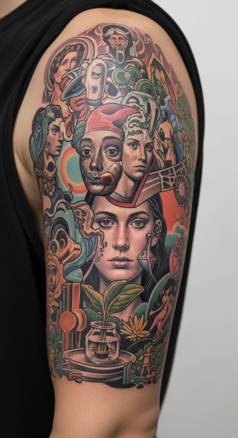 Surreal collages let you combine disparate elements into a cohesive arm narrative. They require strong composition to avoid clutter. Opt for clear focal points. Healing is typical but busy areas need strong contrast to remain legible. Ask the artist to map focal hierarchy.