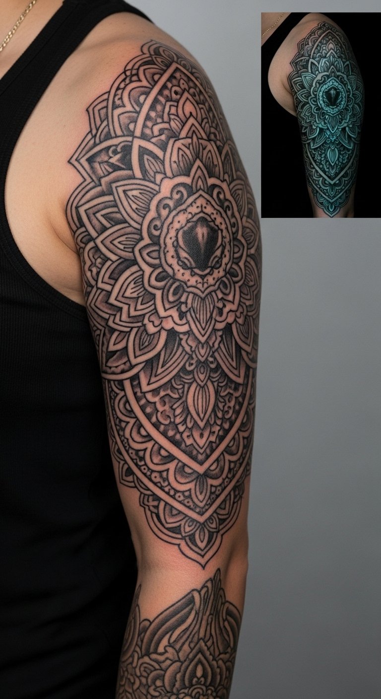 UV accents add a layer of surprise. UV ink is best used sparingly as highlights — it can fade quicker. Ask about long-term phasing and see healed UV images. Common mistake: relying on UV for main lines — use it for accents only.