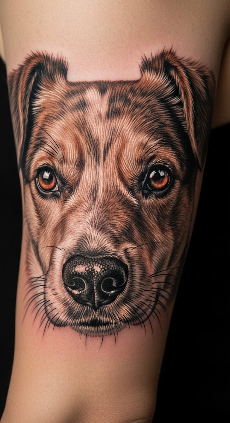 Pet portraits need an artist experienced in skin tones and fur texture. Outer bicep gives space for scale. Small highlight dots are important for life; ensure artist preserves contrast. Ask for healed pet portraits on similar skin tones.