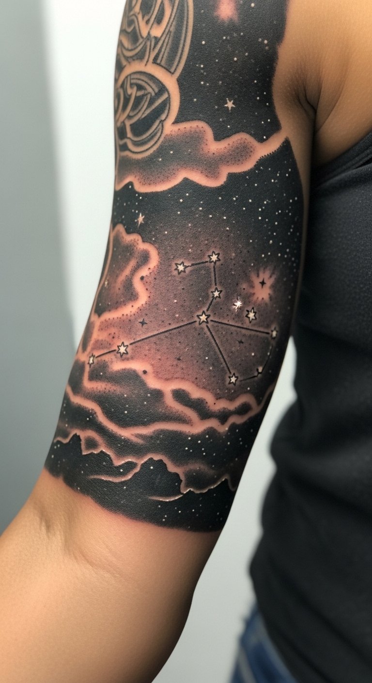 Constellation + Nightscape Half Sleeve on Outer Arm
