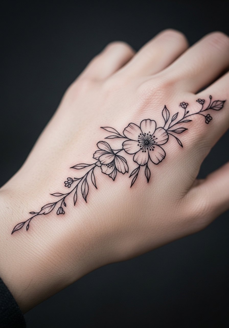 Someone I know first noticed this one on a friend and booked it the next week. Fine line florals read delicate and follow the hand's movement, but the trade-off is that the thinnest lines can blur faster on this visible surface. Tell your artist you want slightly heavier lineweight around petals so the silhouette stays readable at one year. Pain lands at a 5 out of 10 for most people and a session usually runs 30 to 60 minutes. Expect a touch-up at around the 9 to 18 month mark if you want crisp edges. The common mistake is asking for hairline stems that disappear with daily friction.