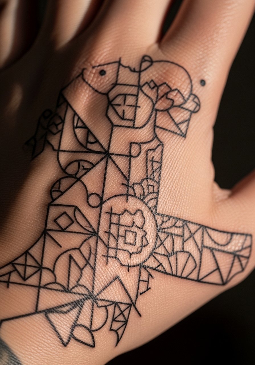 The palm is unusual because callused texture changes how ink deposits, so plan expectations accordingly. Geometric palm pieces trade longevity for a high-modern visual effect. Tell your artist you want bold negative-space breaks so the geometry keeps its optical illusion as the skin wears. Sessions vary by size, often in two short sittings. Pain is odd rather than intense because the palm can be sensitive in patches. The main mistake is demanding ultra-fine geometry on callused areas. Those details vanish faster than you think.