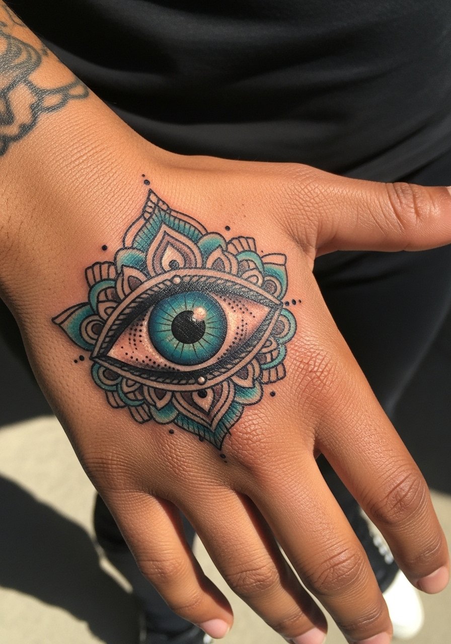 This protective motif reads well on the side of the hand and is easy to conceal with sleeves or larger jewelry. Color accents look striking but will need SPF protection to retain vibrancy. During consultation say you want concentrated black outline with small color fills so touch-ups focus on color only. Sessions are usually one visit under an hour. Pain is moderate near the thumb base. A common misstep is asking for too many tiny colors in the iris, which can turn patchy as pigments migrate.