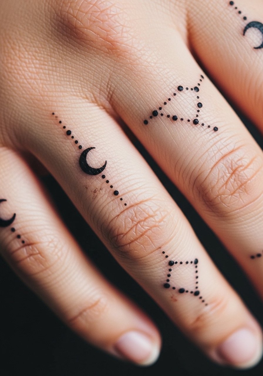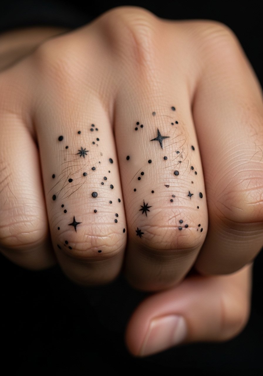 There is a minimalist cosmic trend moving from wrists into knuckles with tiny dot clusters. These are quick to do and can be spread across one or both hands for balance. Tell your artist the exact spacing you want and whether you prefer solid dots or hollow stars. Sessions are brief and the pain is sharp but short. Expect touch-ups sooner than larger designs since knuckles take abuse from grabbing and cleaning. The usual mistake is asking for a dense cluster that becomes an indistinct dark patch within months.