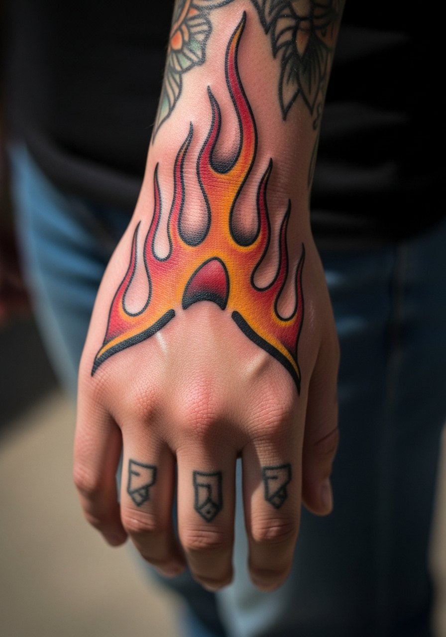 There is a kinetic energy to flame motifs that suits people who want a dynamic silhouette. Bold outlines and saturated fills hold up better here than thin, sketchy flames. Make sure your artist lays down a strong outline and solid color planes so the design reads as it ages. Sessions usually fit into one or two sittings. Pain at the wrist and back of the hand is moderate. A common mistake is choosing painterly, feathered colors that disappear into blotchy patches with regular hand use.