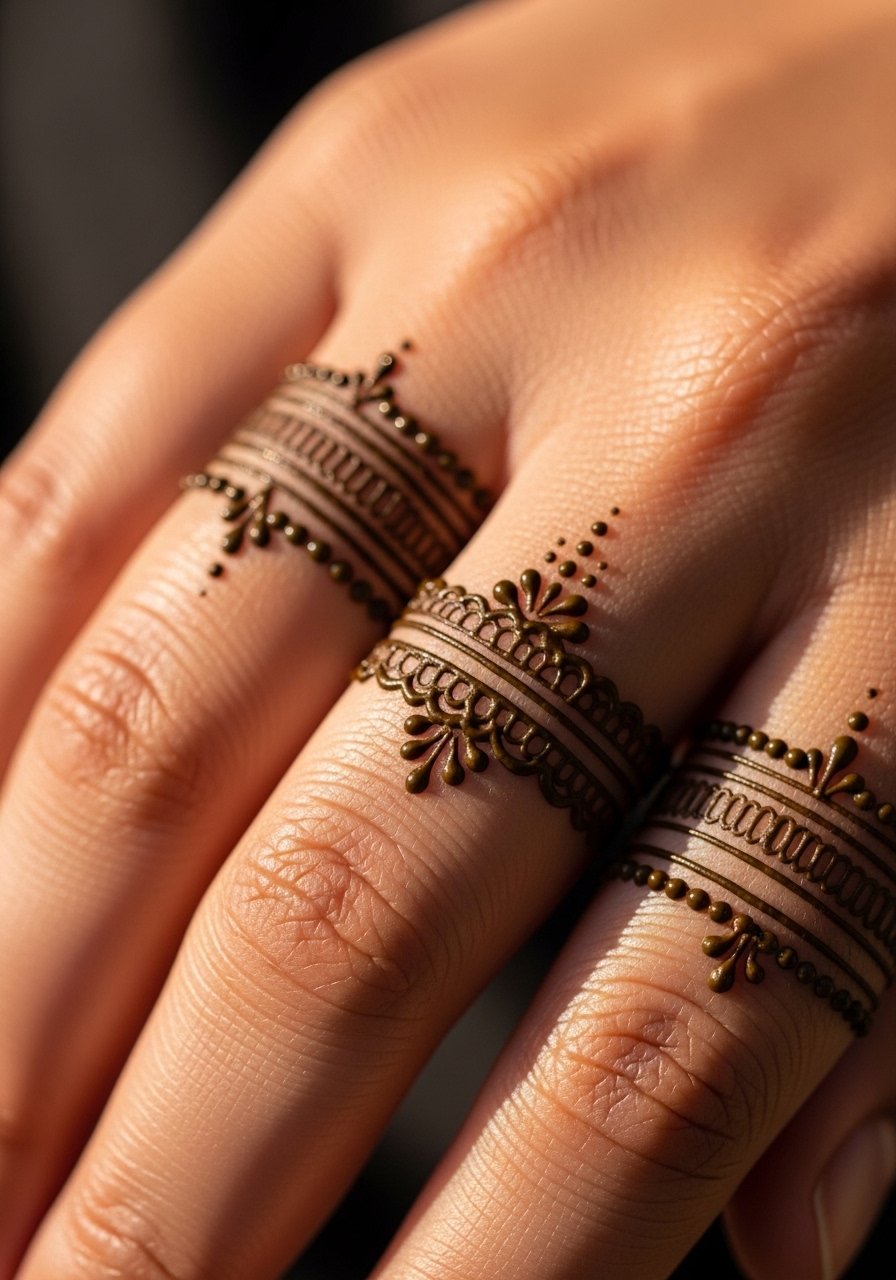 Tiny center-finger crests are subtle but give a strong henna nod. They’re handy for stacking with rings but fade faster than hand panels. I recommend stronger primary lines and minimal delicate fillers for longevity. Artists should discuss touch-up expectations up front.