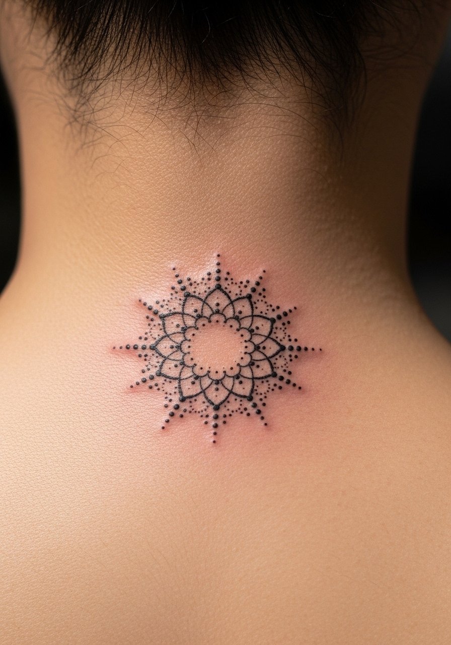 A small cluster at the nape reads like henna peeking out when your hair is up. It’s one of those spots that feels intimate and ages well because it doesn’t get constant sun. Pain is mild, and touch-ups are easy. I’ve noticed artists keep the center slightly bolder to maintain structure as dotwork softens. Avoid excessively thin spokes that can disappear into the skin tone over time.