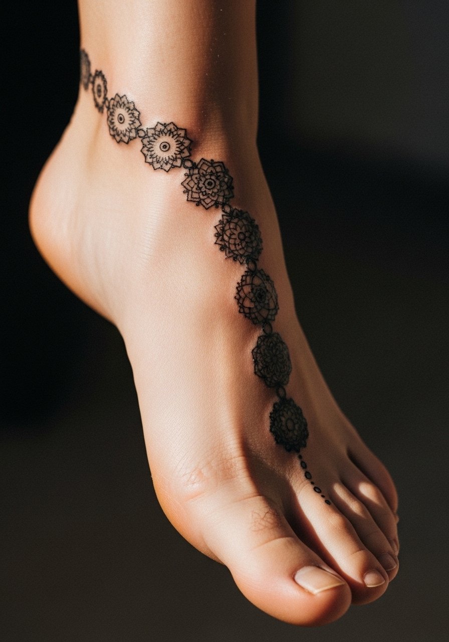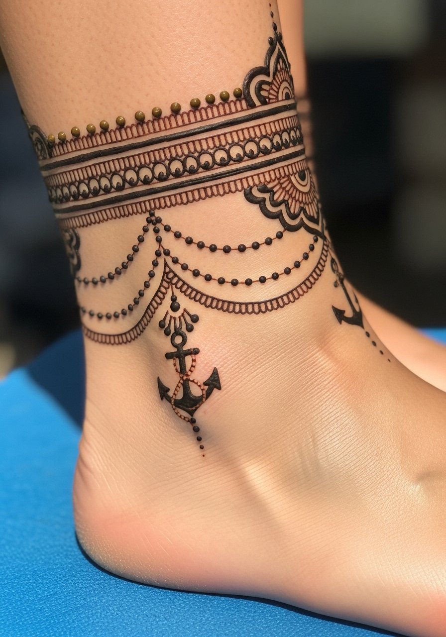 A chain of linked motifs gives that henna wrap effect around the ankle and foot. It’s comfortable to heal if you plan footwear accordingly. I prefer slightly bolder anchors with delicate connecting dots—too many tiny lines in the chain blur. Ask your artist to map placement with shoes you actually wear.